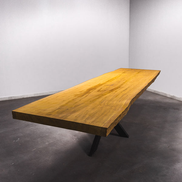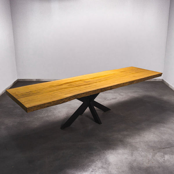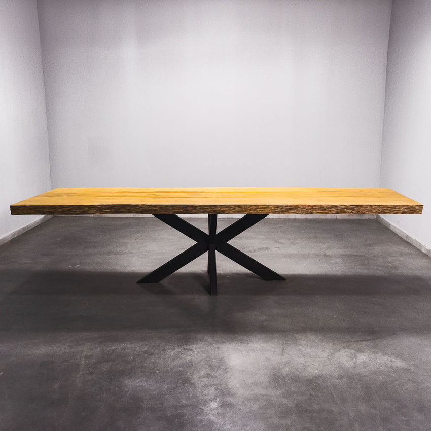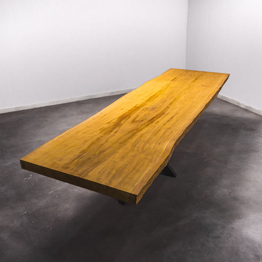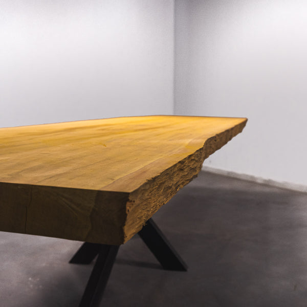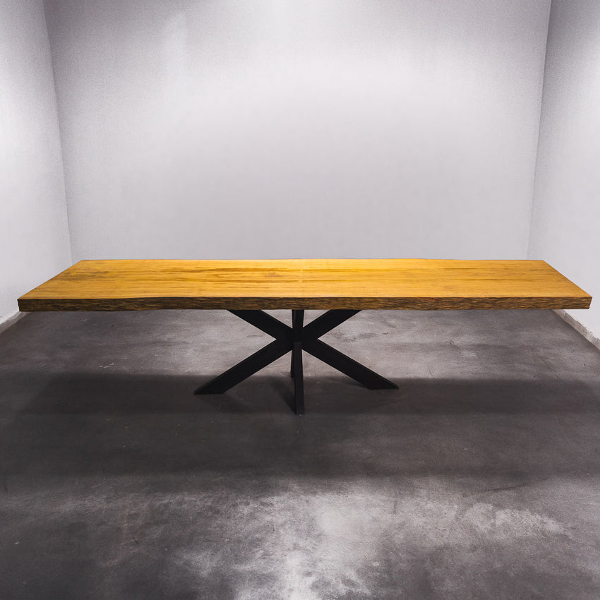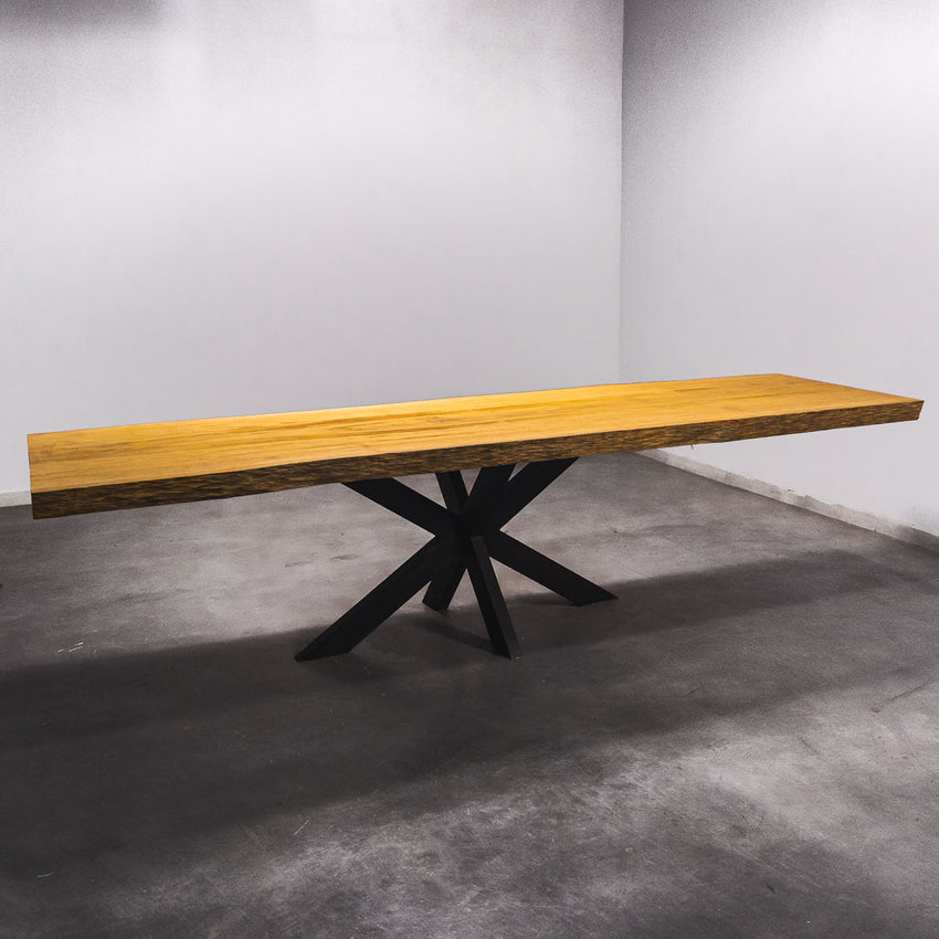 De tafel is gemaakt uit één stuk massief BIlinga-hout en is 7 cm dik. Daardoor is het hout zeer duurzaam en sterk. Natuurlijk willen wij alleen het beste voor onze klanten, en daarom wordt het hout tot 10 / 12% gedroogd. De onderkant is versterkt met stalen profielen om ervoor te zorgen dat het hout nauwelijks beweegt.