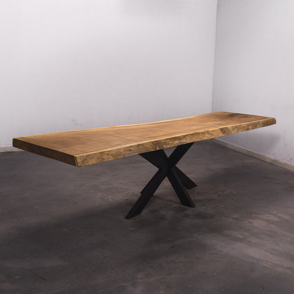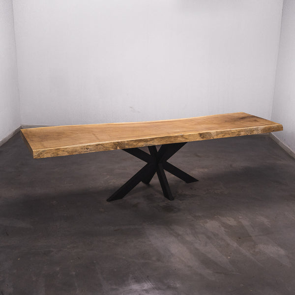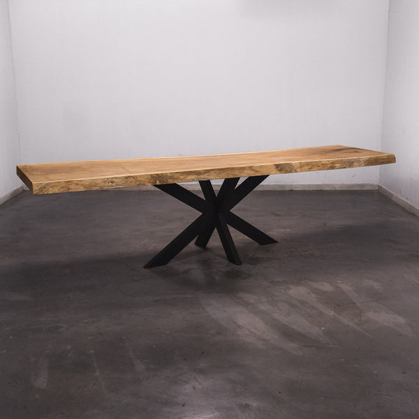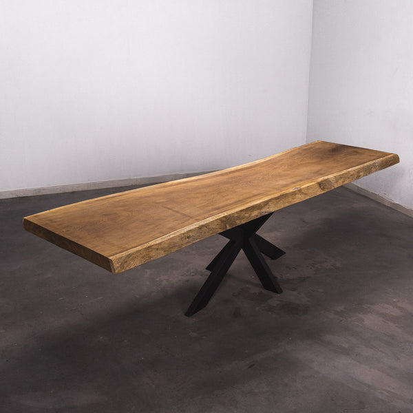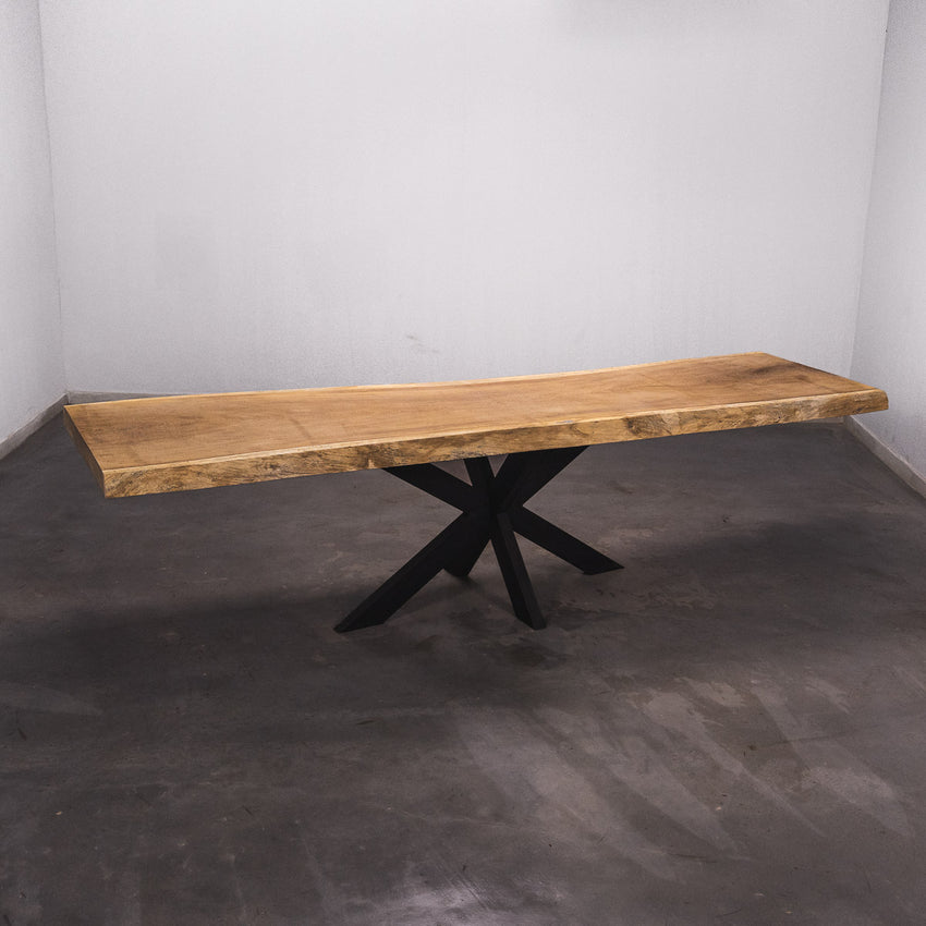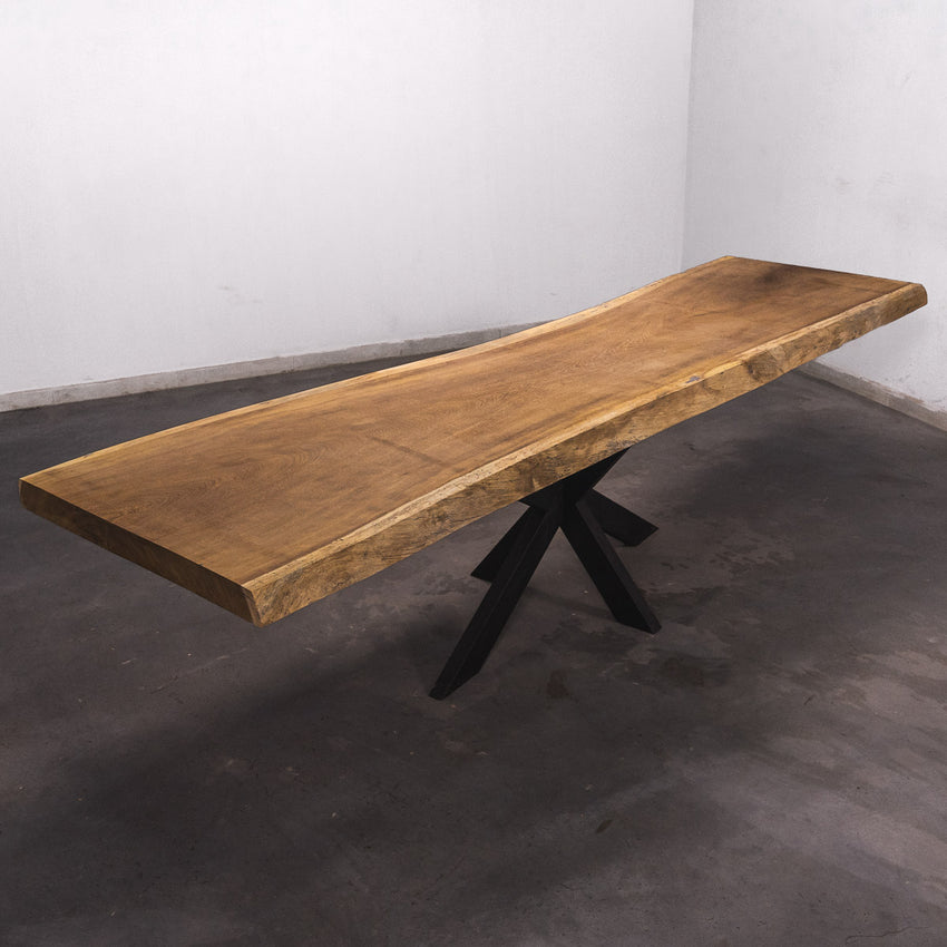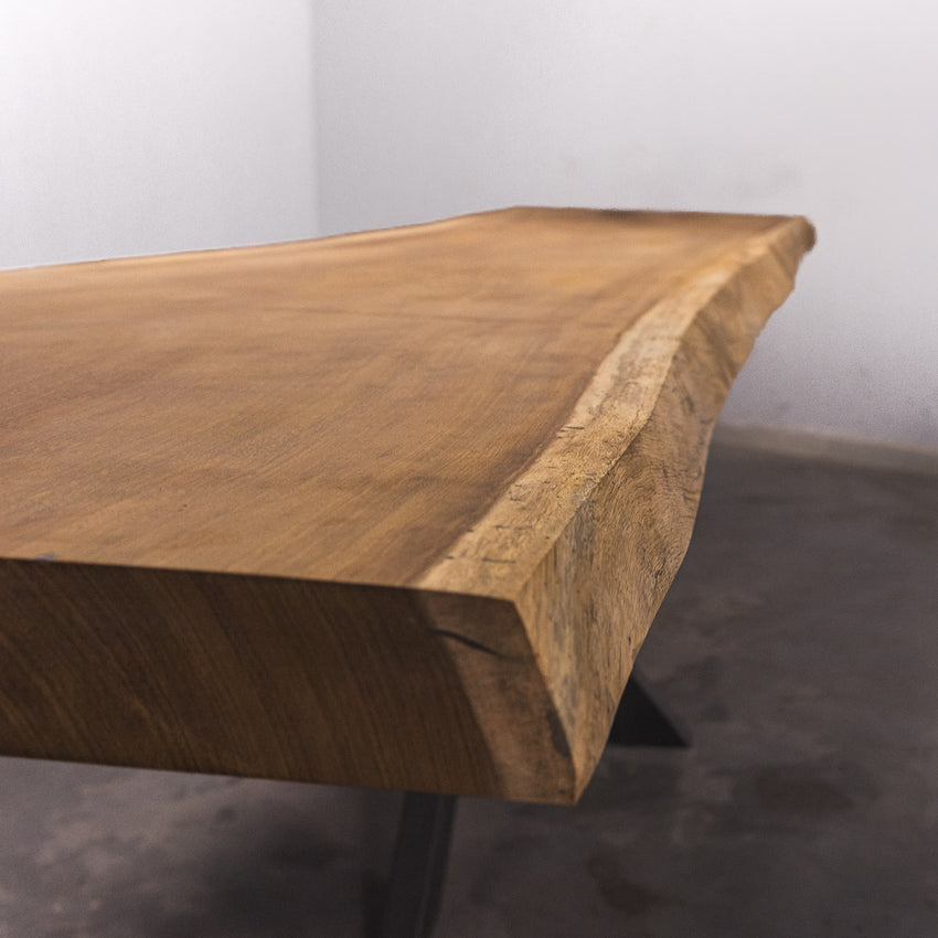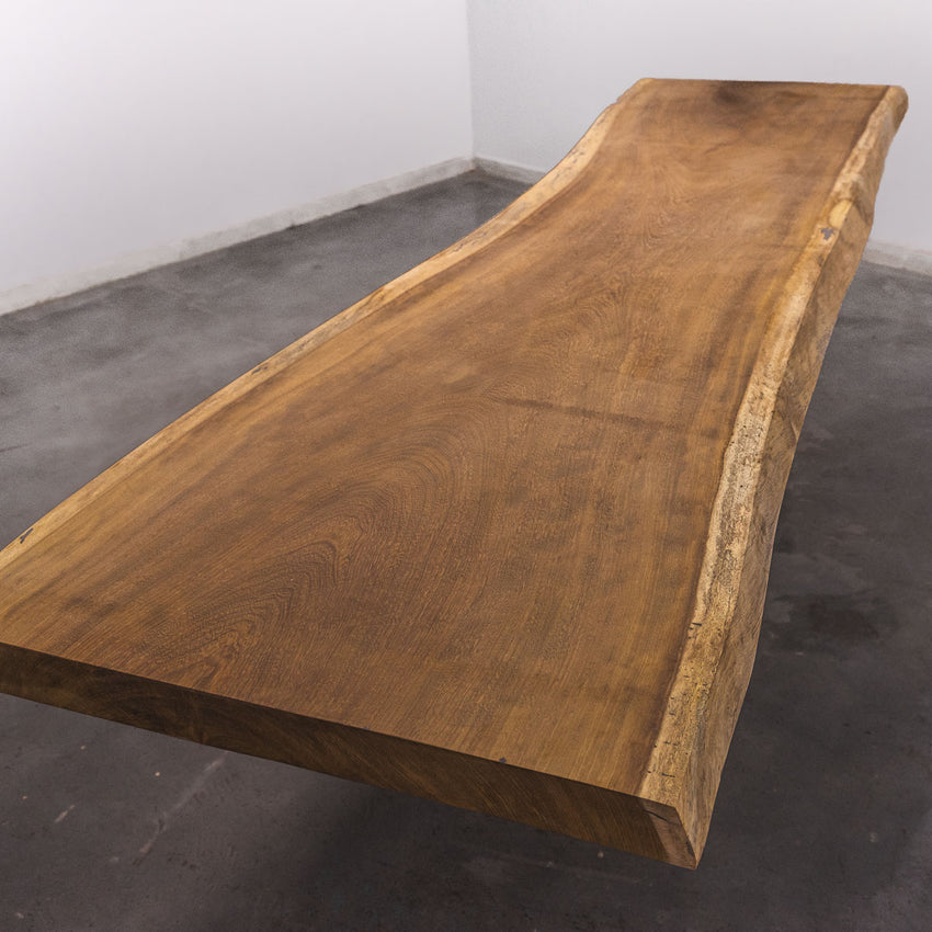 De tafel is gemaakt uit één stuk massief Iroko-hout en is 7 cm dik. Daardoor is het hout zeer duurzaam en sterk. Natuurlijk willen wij alleen het beste voor onze klanten, en daarom wordt het hout tot 10 / 12% gedroogd. De onderkant is versterkt met stalen profielen om ervoor te zorgen dat het hout nauwelijks beweegt.