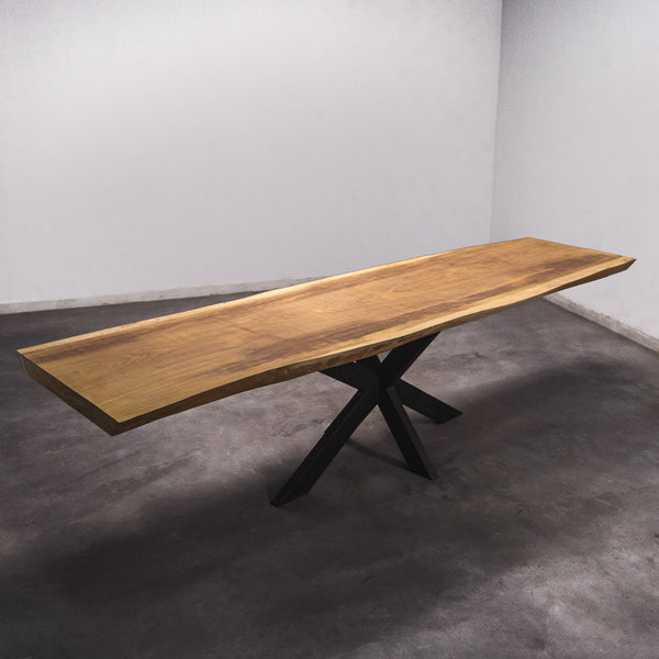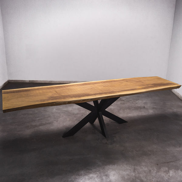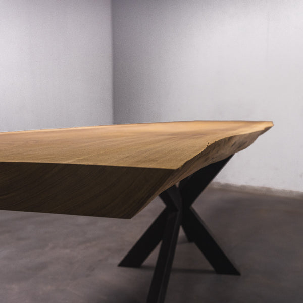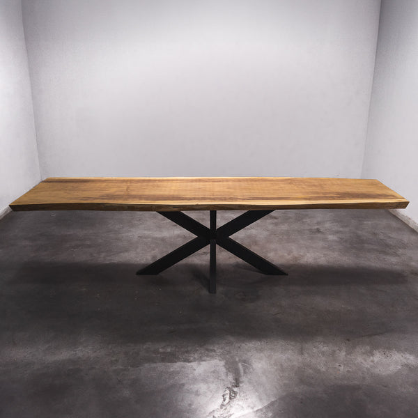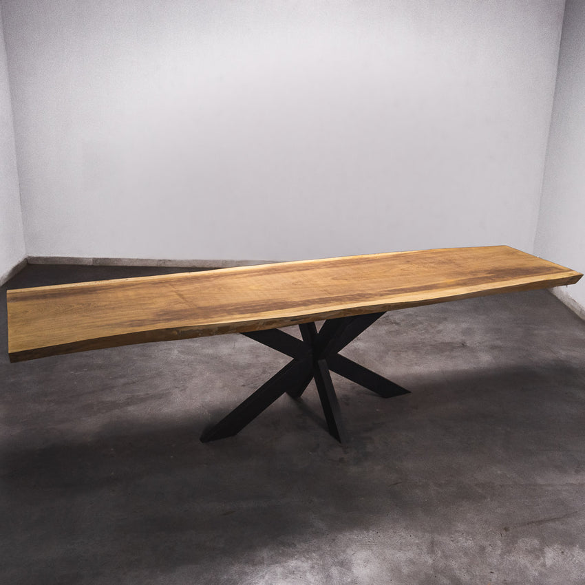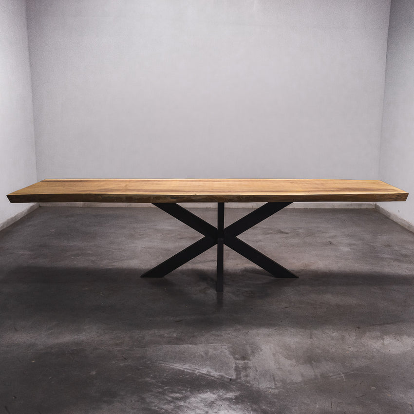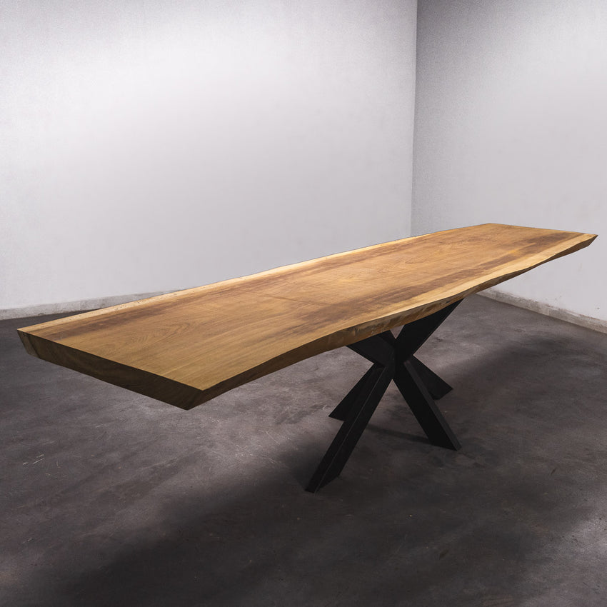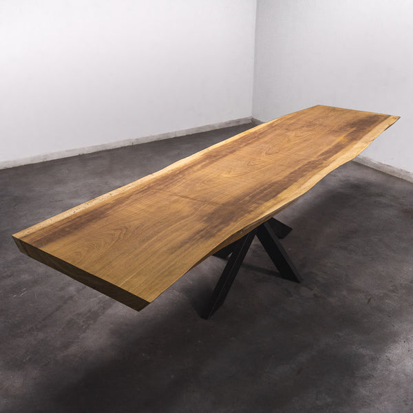 De tafel is gemaakt uit één stuk massief Iroko-hout en is 7 cm dik. Daardoor is het hout zeer duurzaam en sterk. Natuurlijk willen wij alleen het beste voor onze klanten, en daarom wordt het hout tot 10 / 12% gedroogd. De onderkant is versterkt met stalen profielen om ervoor te zorgen dat het hout nauwelijks beweegt.