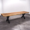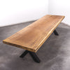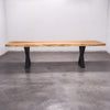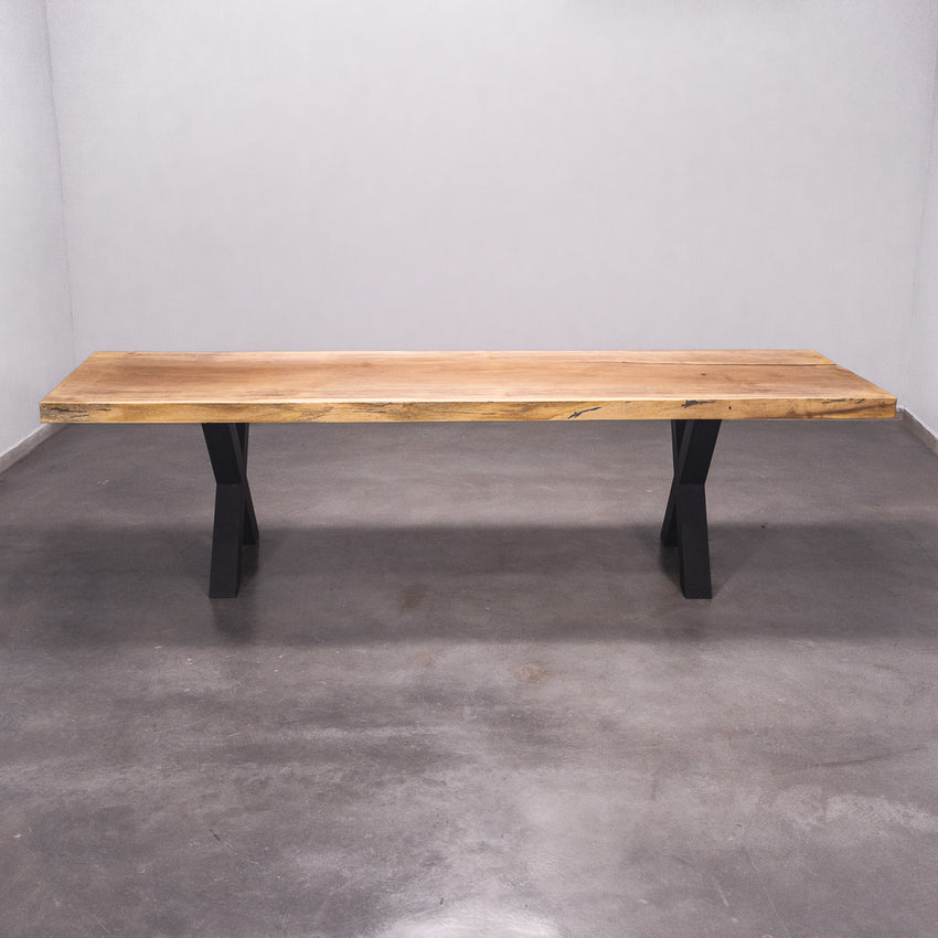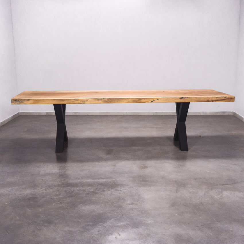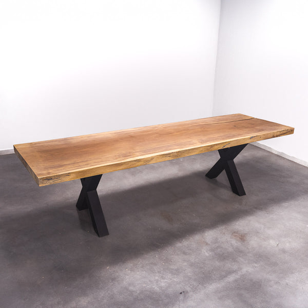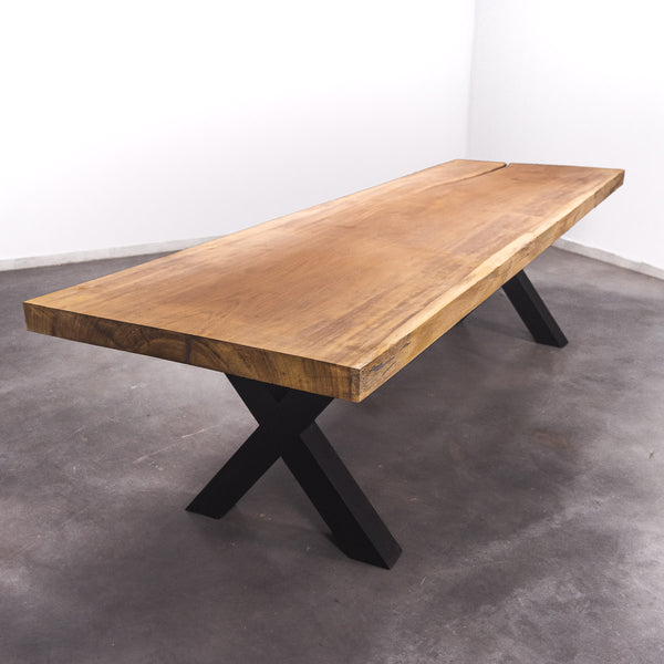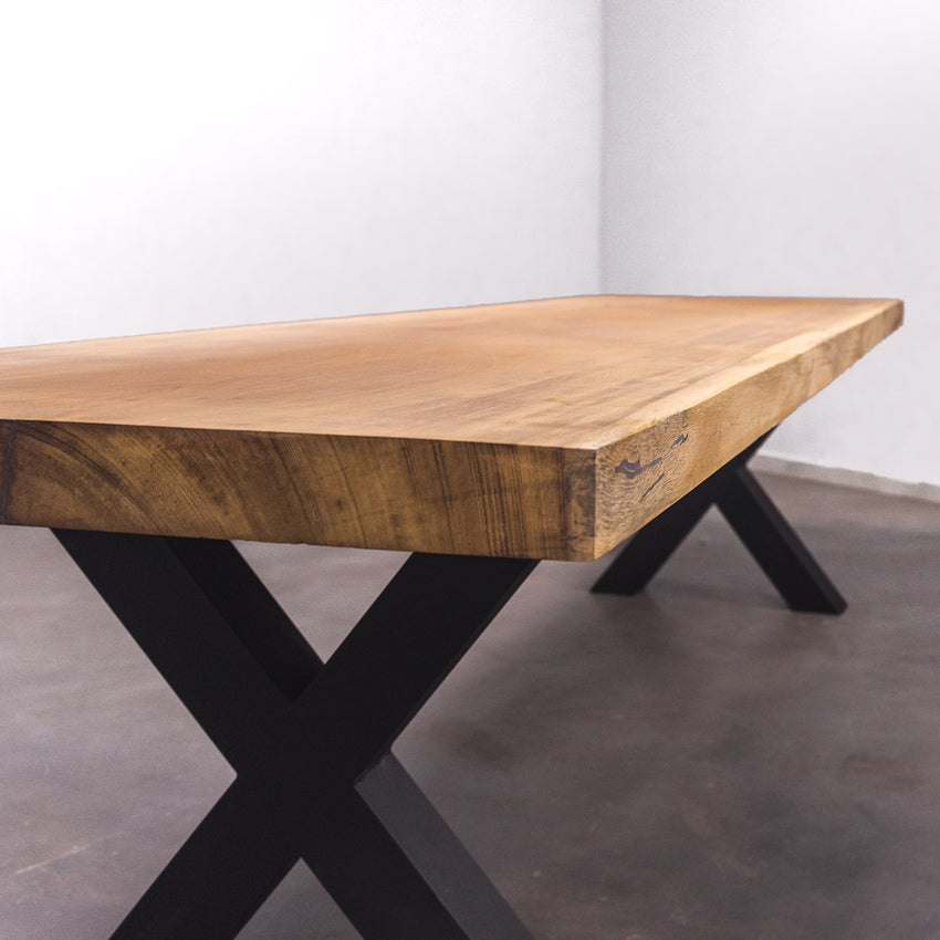 De tafel is gemaakt uit één stuk massief Iroko-hout en is 7 cm dik. Daardoor is het hout zeer duurzaam en sterk. Natuurlijk willen wij alleen het beste voor onze klanten, en daarom wordt het hout tot 10 / 12% gedroogd. De onderkant is versterkt met stalen profielen om ervoor te zorgen dat het hout nauwelijks beweegt.