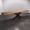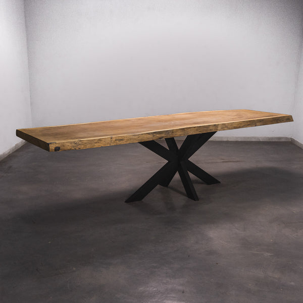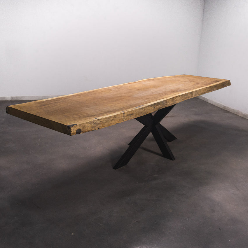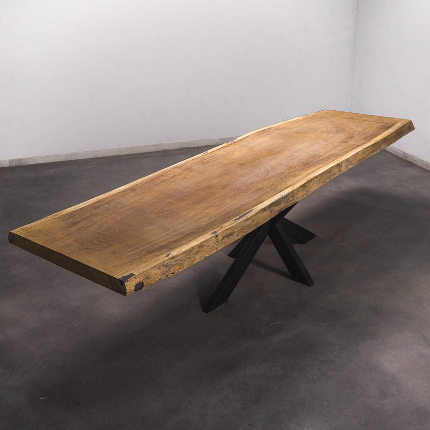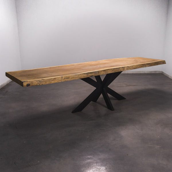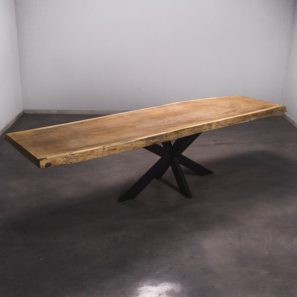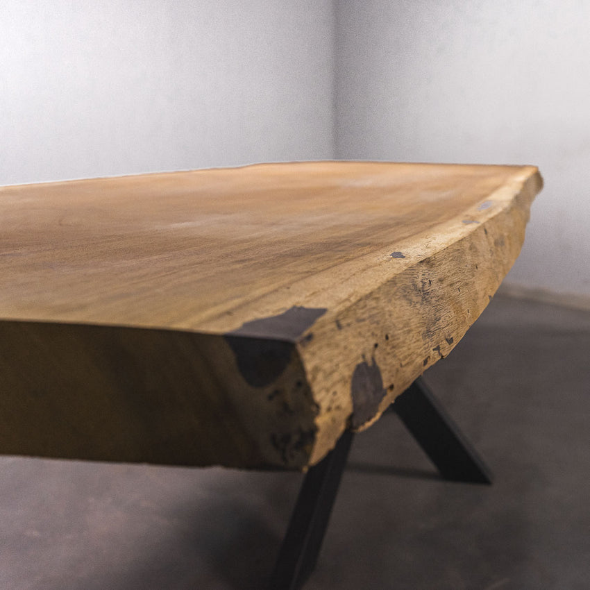 De tafel is gemaakt uit één stuk massief Iroko-hout en is 7 cm dik. Daardoor is het hout zeer duurzaam en sterk. Natuurlijk willen wij alleen het beste voor onze klanten, en daarom wordt het hout tot 10 / 12% gedroogd. De onderkant is versterkt met stalen profielen om ervoor te zorgen dat het hout nauwelijks beweegt.