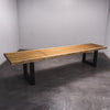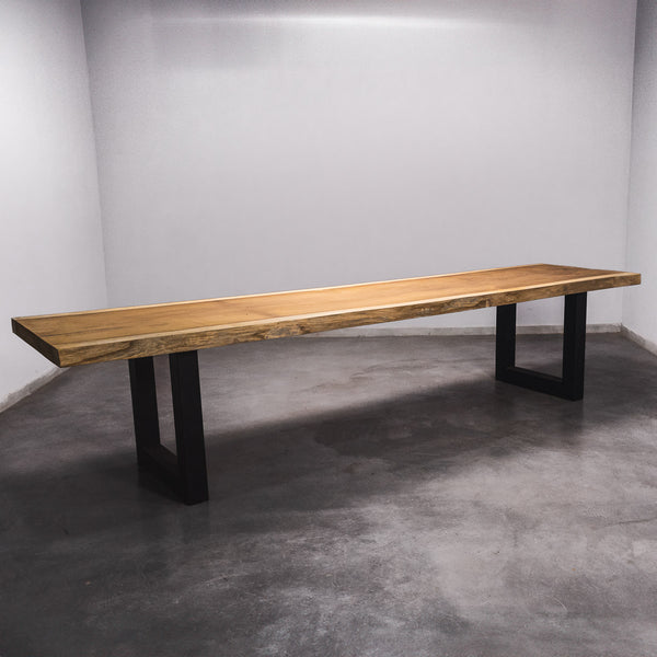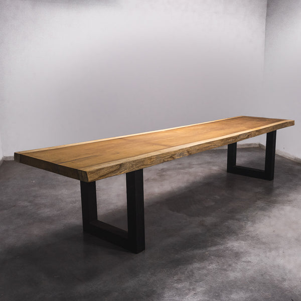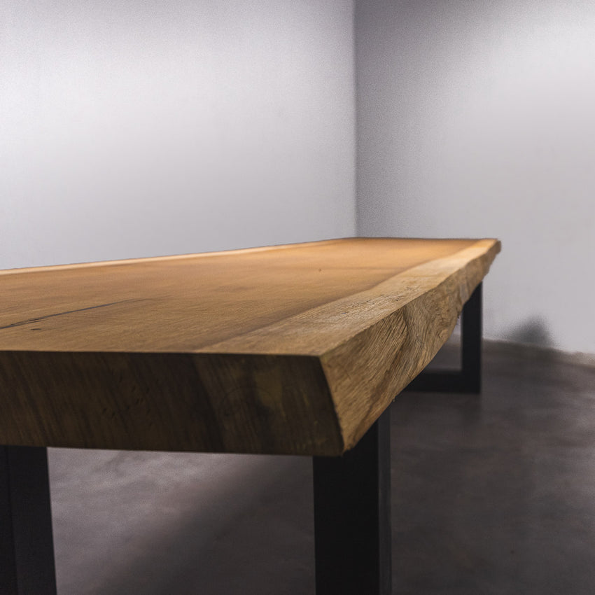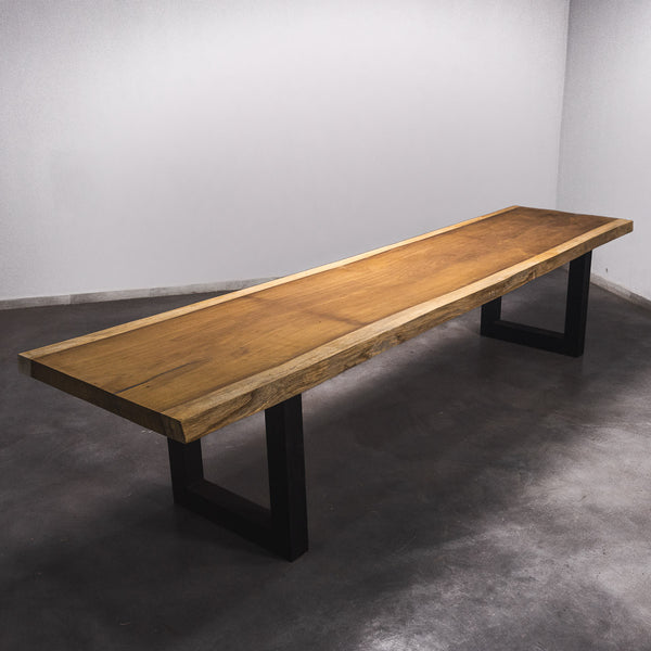 De tafel is gemaakt uit één stuk massief Iroko-hout en is 7 cm dik. Daardoor is het hout zeer duurzaam en sterk. Natuurlijk willen wij alleen het beste voor onze klanten, en daarom wordt het hout tot 10 / 12% gedroogd. De onderkant is versterkt met stalen profielen om ervoor te zorgen dat het hout nauwelijks beweegt.