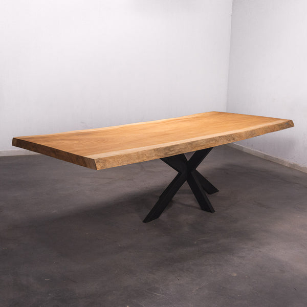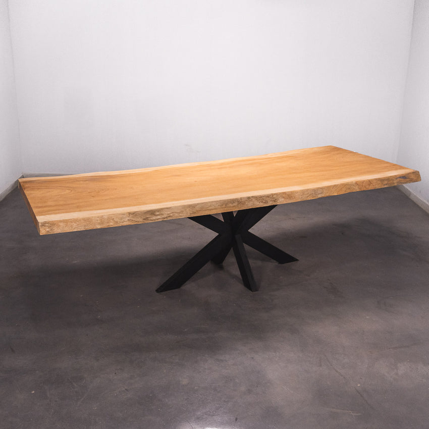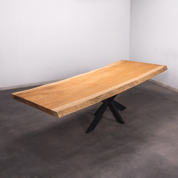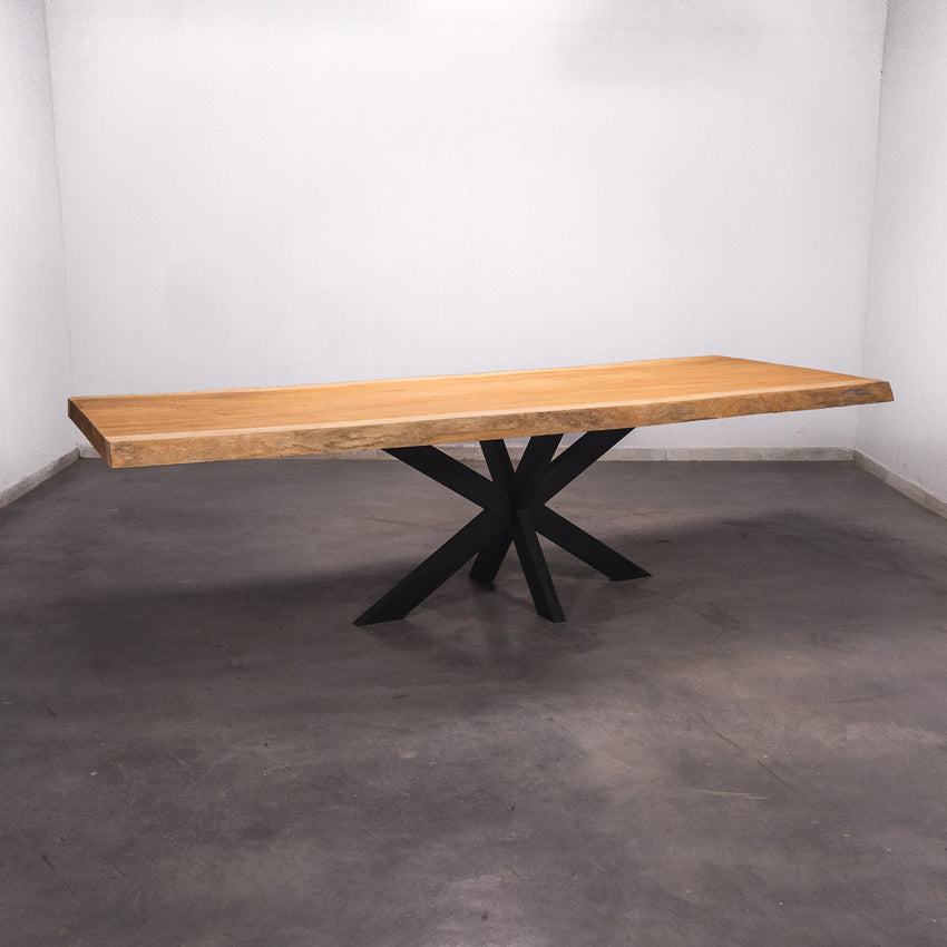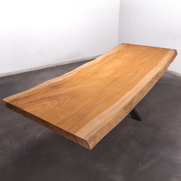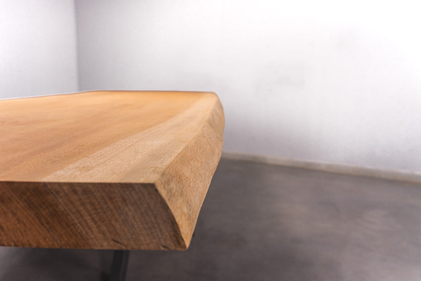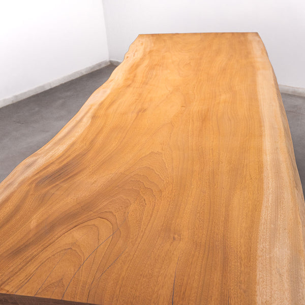De tafel is gemaakt uit één stuk massief Sipo-hout en is 7 cm dik. Daardoor is het hout zeer duurzaam en sterk. Natuurlijk willen wij alleen het beste voor onze klanten, en daarom wordt het hout tot 10 / 12% gedroogd. De onderkant is versterkt met stalen profielen om ervoor te zorgen dat het hout nauwelijks beweegt.