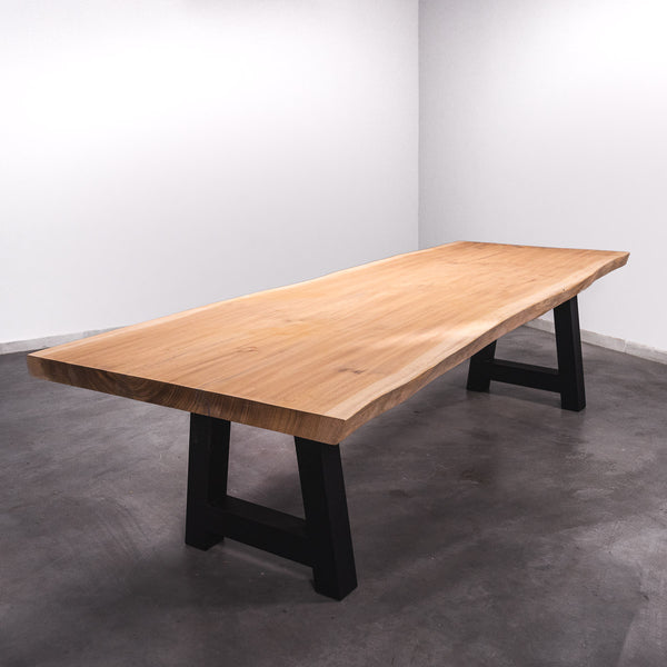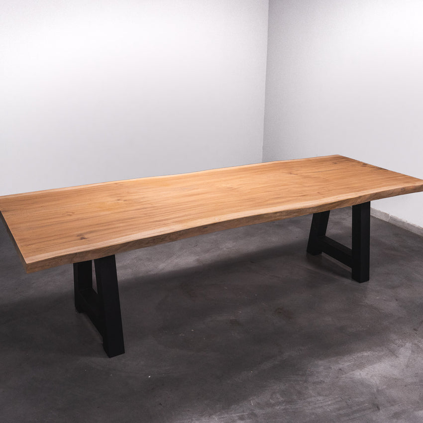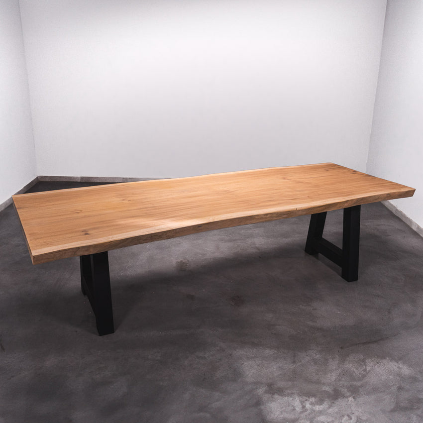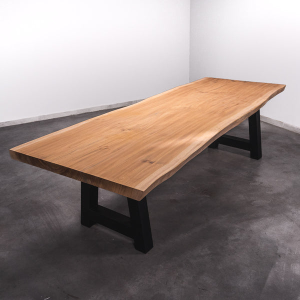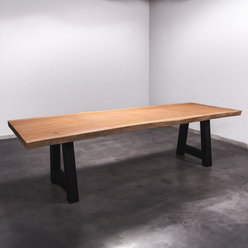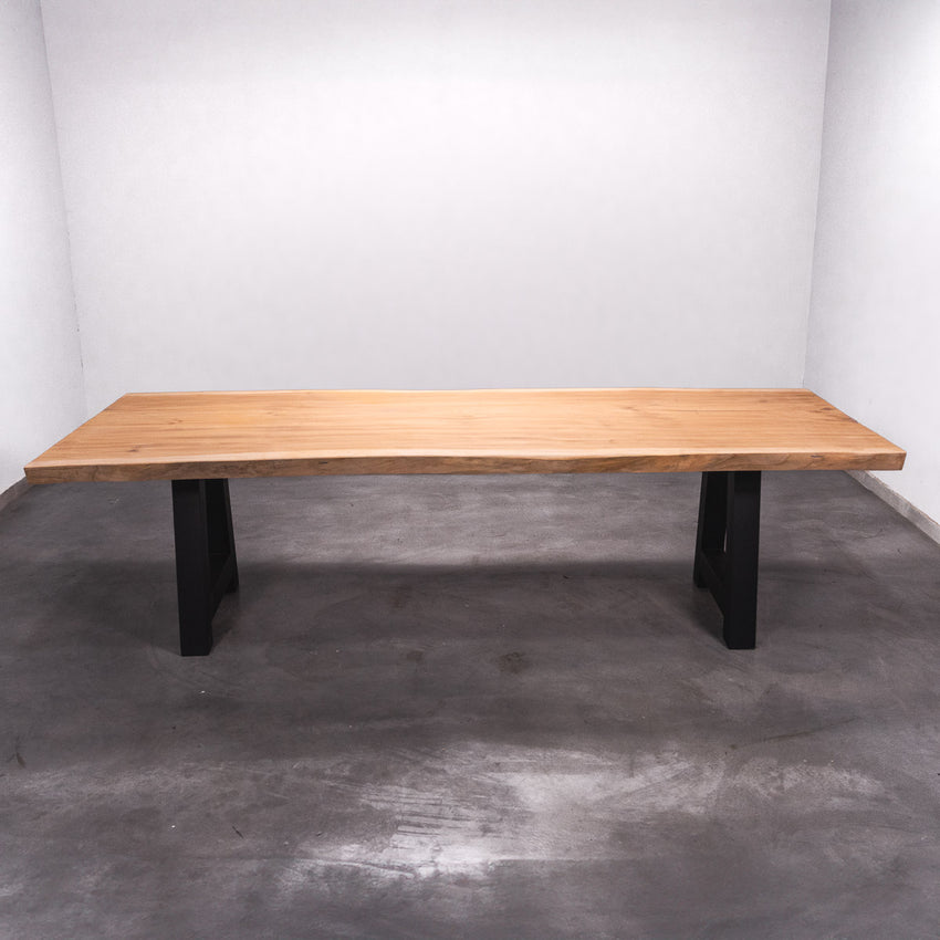De tafel is gemaakt uit één stuk massief Sipo-hout en is 7 cm dik. Daardoor is het hout zeer duurzaam en sterk. Natuurlijk willen wij alleen het beste voor onze klanten, en daarom wordt het hout tot 10 / 12% gedroogd. De onderkant is versterkt met stalen profielen om ervoor te zorgen dat het hout nauwelijks beweegt.