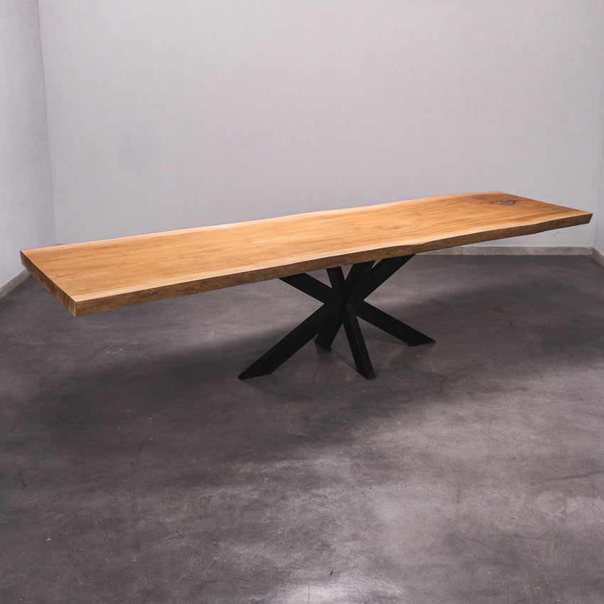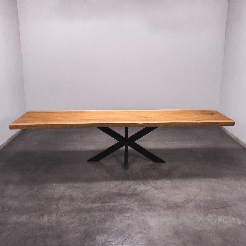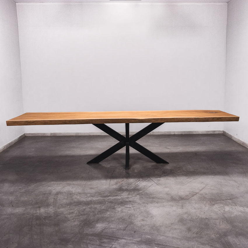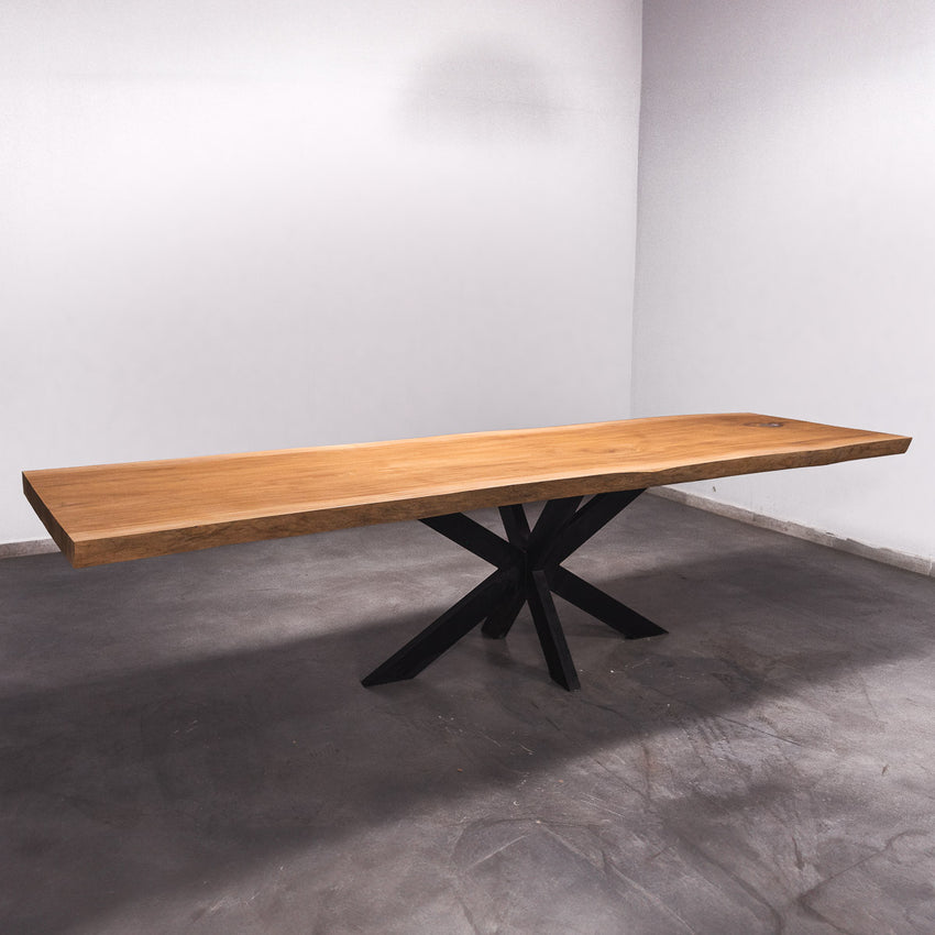De tafel is gemaakt uit één stuk massief Sipo-hout en is 7 cm dik. Daardoor is het hout zeer duurzaam en sterk. Natuurlijk willen wij alleen het beste voor onze klanten, en daarom wordt het hout tot 10 / 12% gedroogd. De onderkant is versterkt met stalen profielen om ervoor te zorgen dat het hout nauwelijks beweegt.