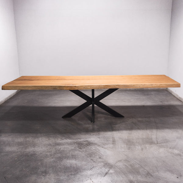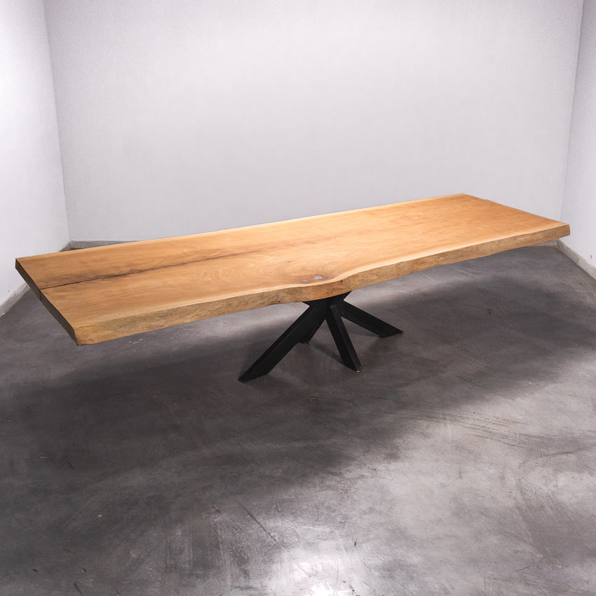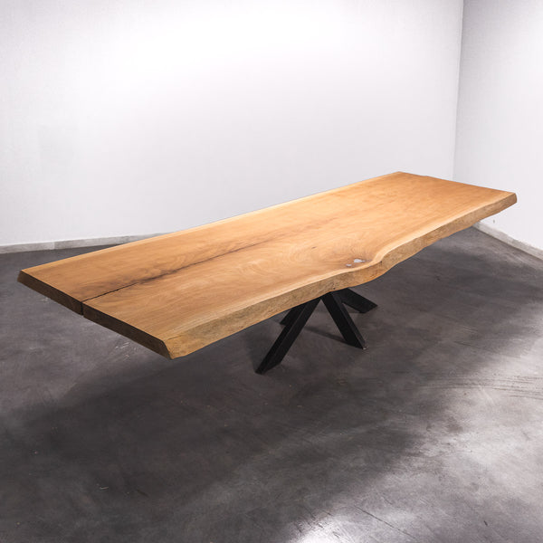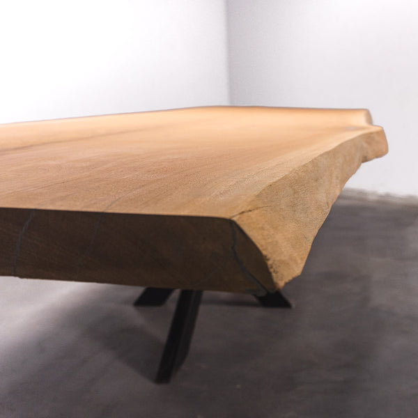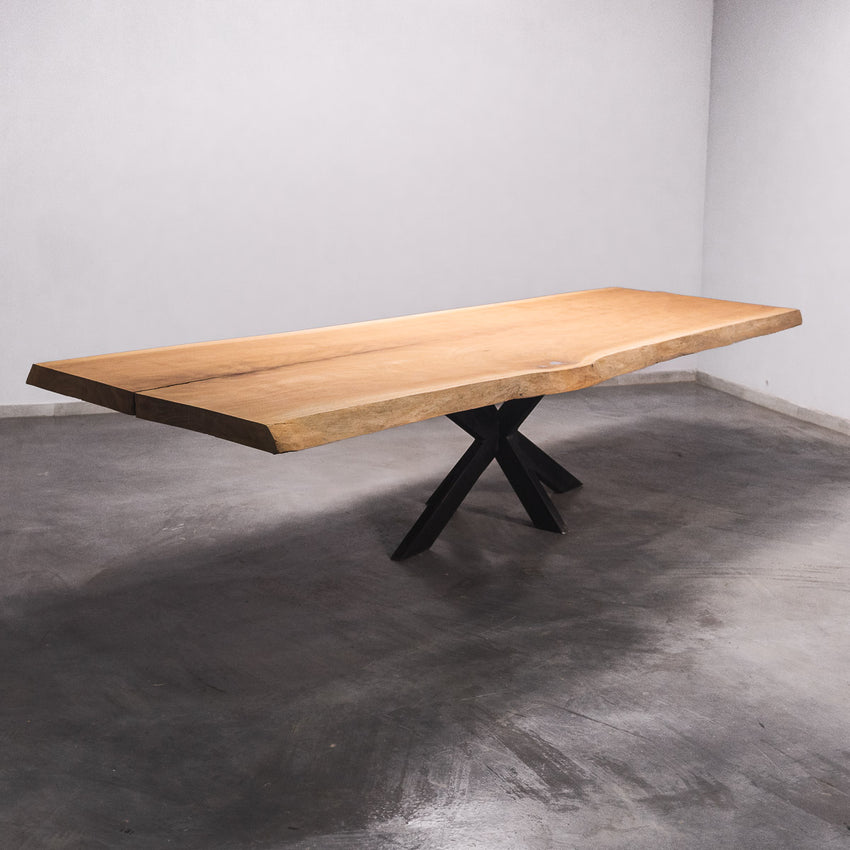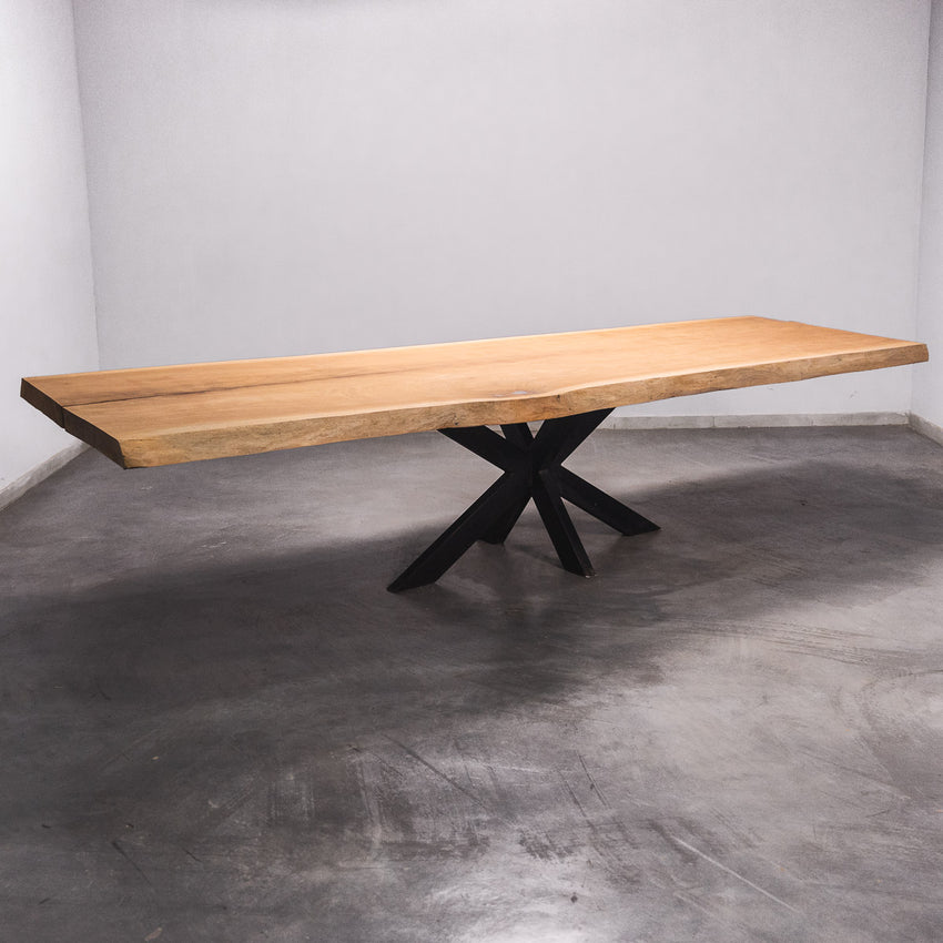 De tafel is gemaakt uit één stuk massief Sipo-hout en is 7 cm dik. Daardoor is het hout zeer duurzaam en sterk. Natuurlijk willen wij alleen het beste voor onze klanten, en daarom wordt het hout tot 10 / 12% gedroogd. De onderkant is versterkt met stalen profielen om ervoor te zorgen dat het hout nauwelijks beweegt.