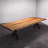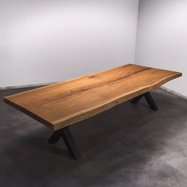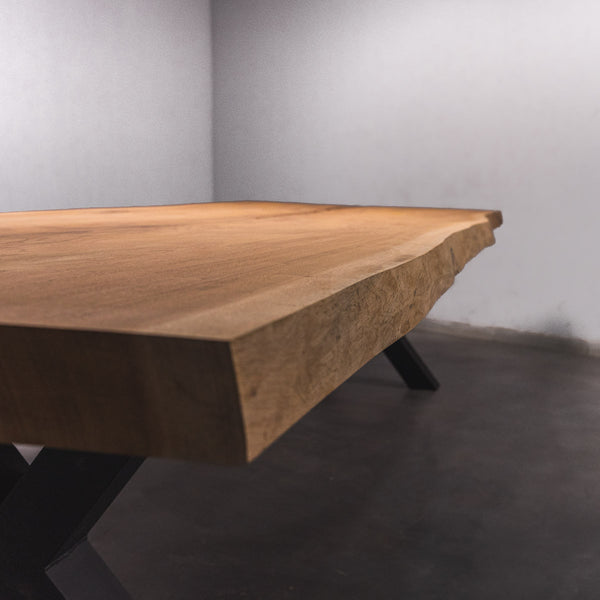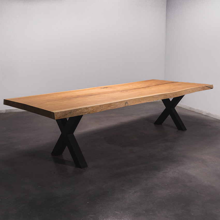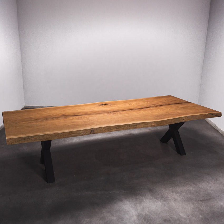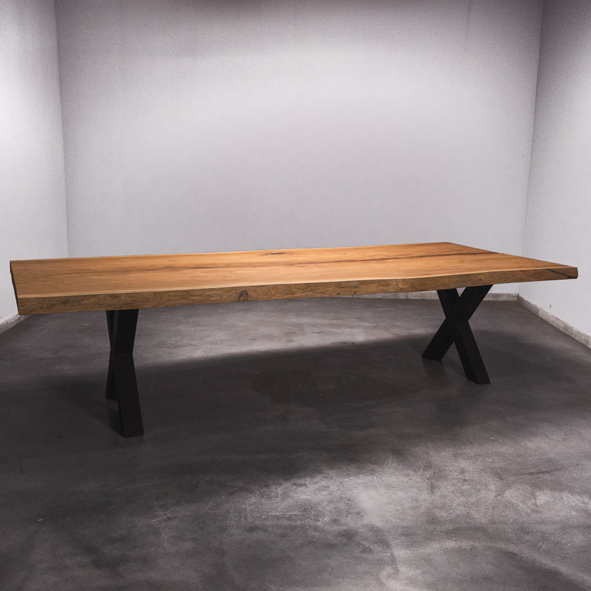 De tafel is gemaakt uit één stuk massief Sipo-hout en is 7 cm dik. Daardoor is het hout zeer duurzaam en sterk. Natuurlijk willen wij alleen het beste voor onze klanten, en daarom wordt het hout tot 10 / 12% gedroogd. De onderkant is versterkt met stalen profielen om ervoor te zorgen dat het hout nauwelijks beweegt.
