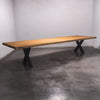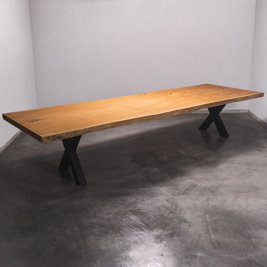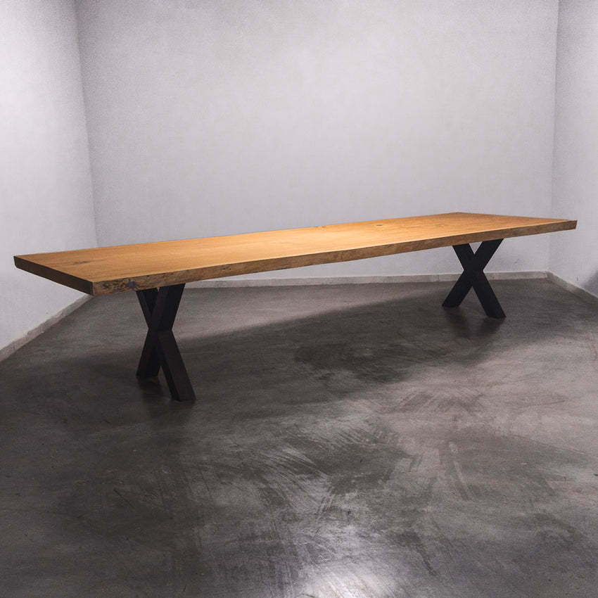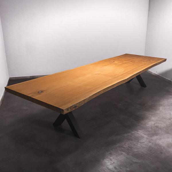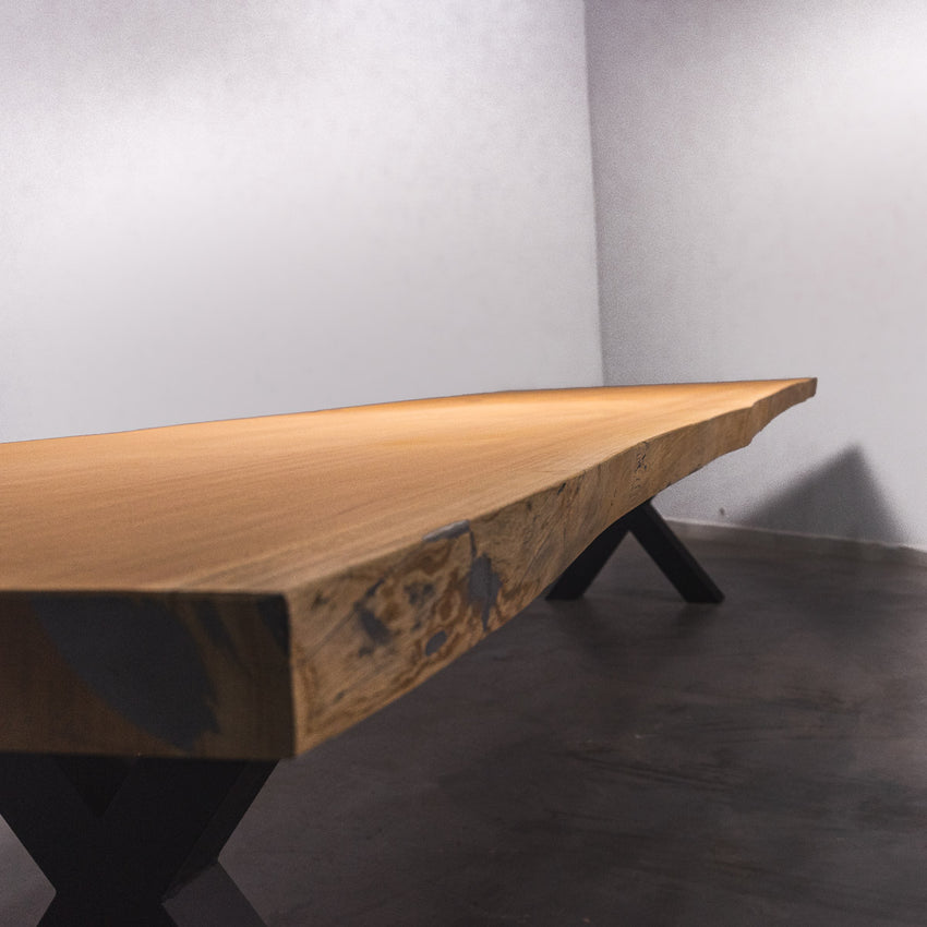 De tafel is gemaakt uit één stuk massief Sipo-hout en is 7 cm dik. Daardoor is het hout zeer duurzaam en sterk. Natuurlijk willen wij alleen het beste voor onze klanten, en daarom wordt het hout tot 10 / 12% gedroogd. De onderkant is versterkt met stalen profielen om ervoor te zorgen dat het hout nauwelijks beweegt.