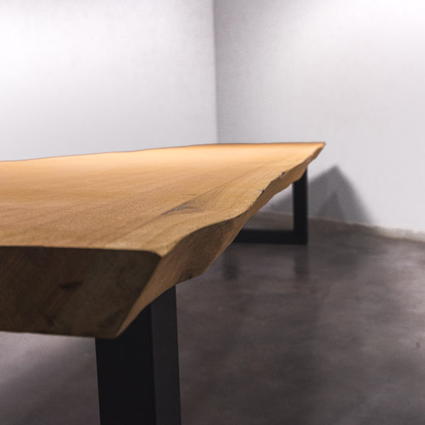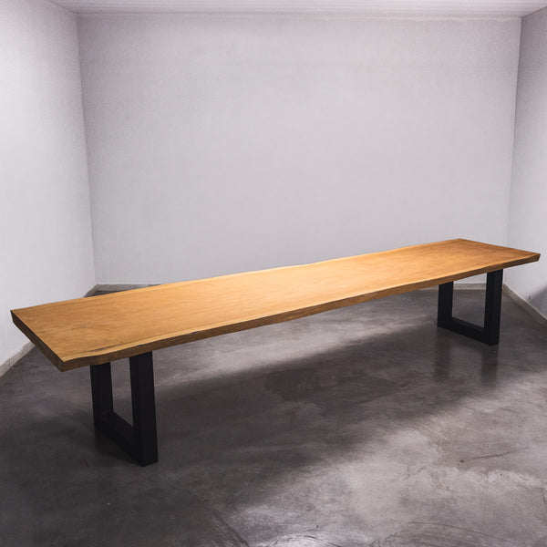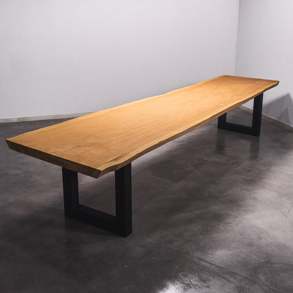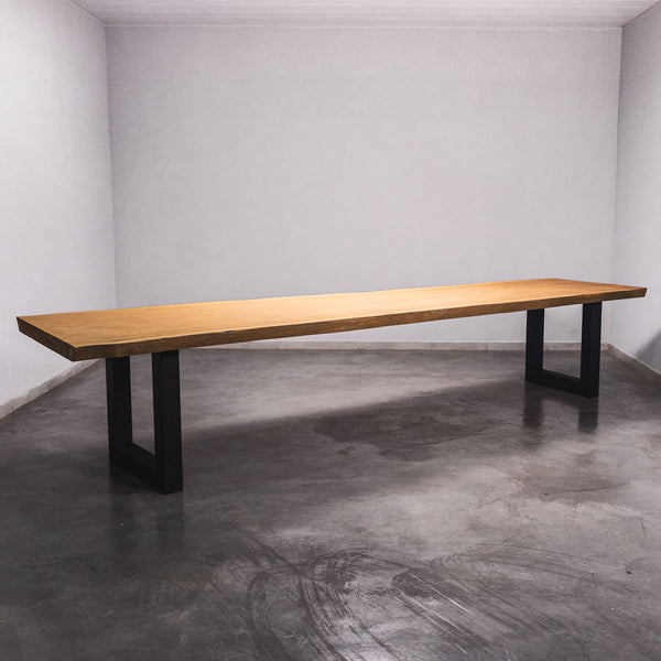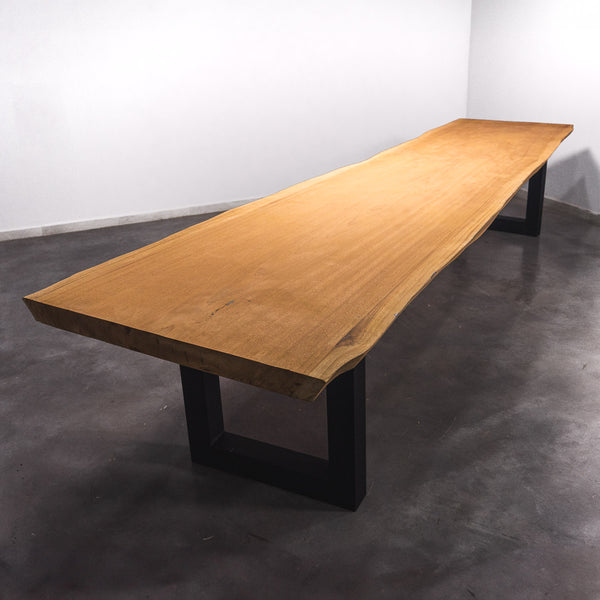 De tafel is gemaakt uit één stuk massief Sipo-hout en is 7 cm dik. Daardoor is het hout zeer duurzaam en sterk. Natuurlijk willen wij alleen het beste voor onze klanten, en daarom wordt het hout tot 10 / 12% gedroogd. De onderkant is versterkt met stalen profielen om ervoor te zorgen dat het hout nauwelijks beweegt.