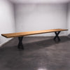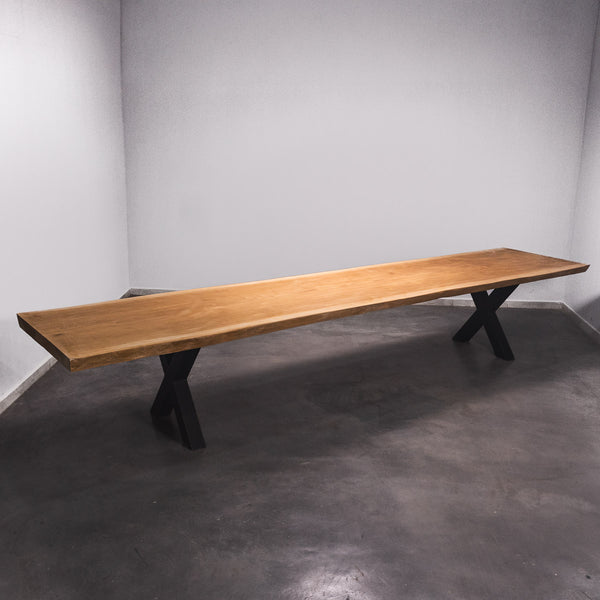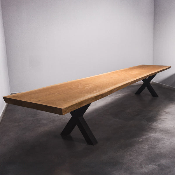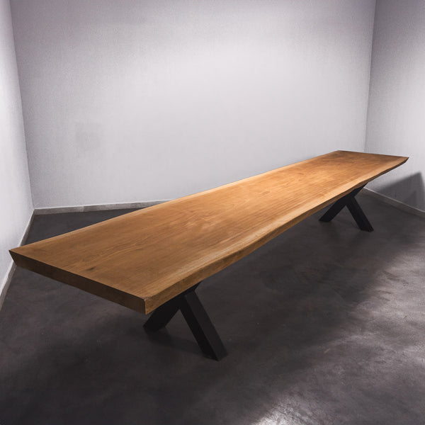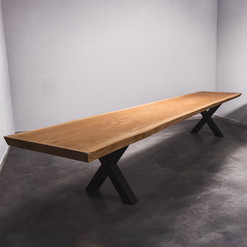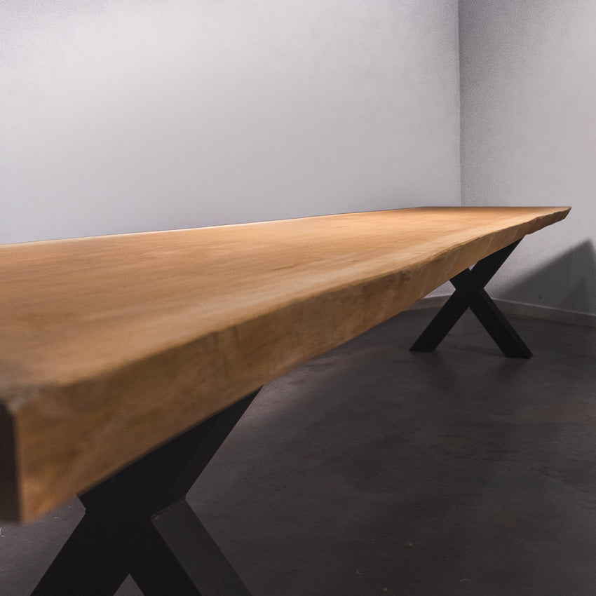 De tafel is gemaakt uit één stuk massief Sipo-hout en is 7 cm dik. Daardoor is het hout zeer duurzaam en sterk. Natuurlijk willen wij alleen het beste voor onze klanten, en daarom wordt het hout tot 10 / 12% gedroogd. De onderkant is versterkt met stalen profielen om ervoor te zorgen dat het hout nauwelijks beweegt.
