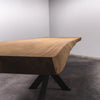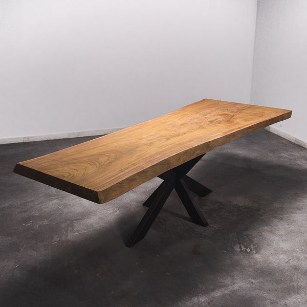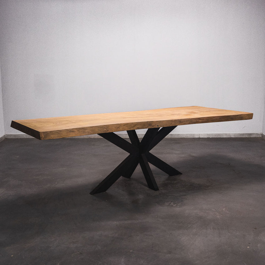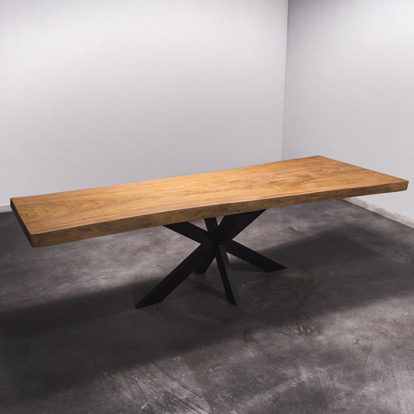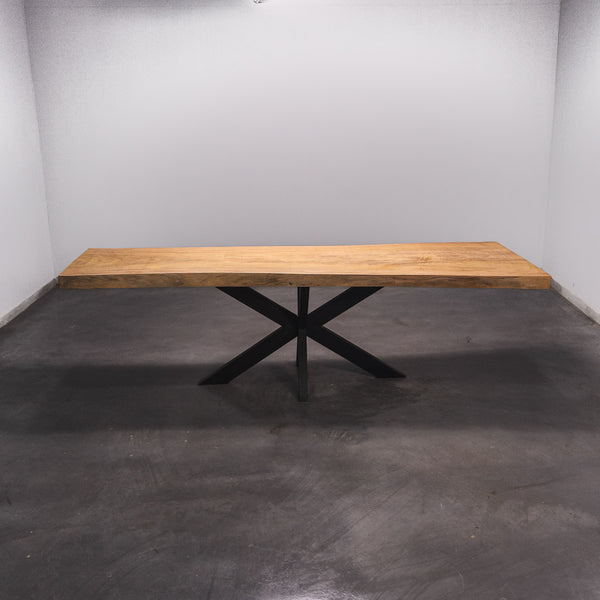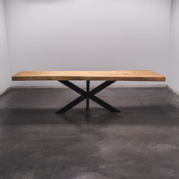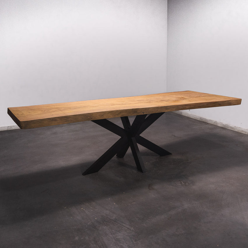 De tafel is gemaakt uit één stuk massief Tali-hout en is 7 cm dik. Daardoor is het hout zeer duurzaam en sterk. Natuurlijk willen wij alleen het beste voor onze klanten, en daarom wordt het hout tot 10 / 12% gedroogd. De onderkant is versterkt met stalen profielen om ervoor te zorgen dat het hout nauwelijks beweegt.