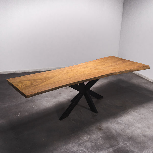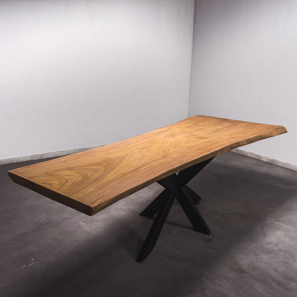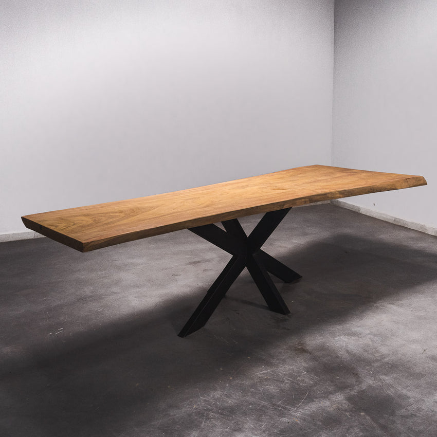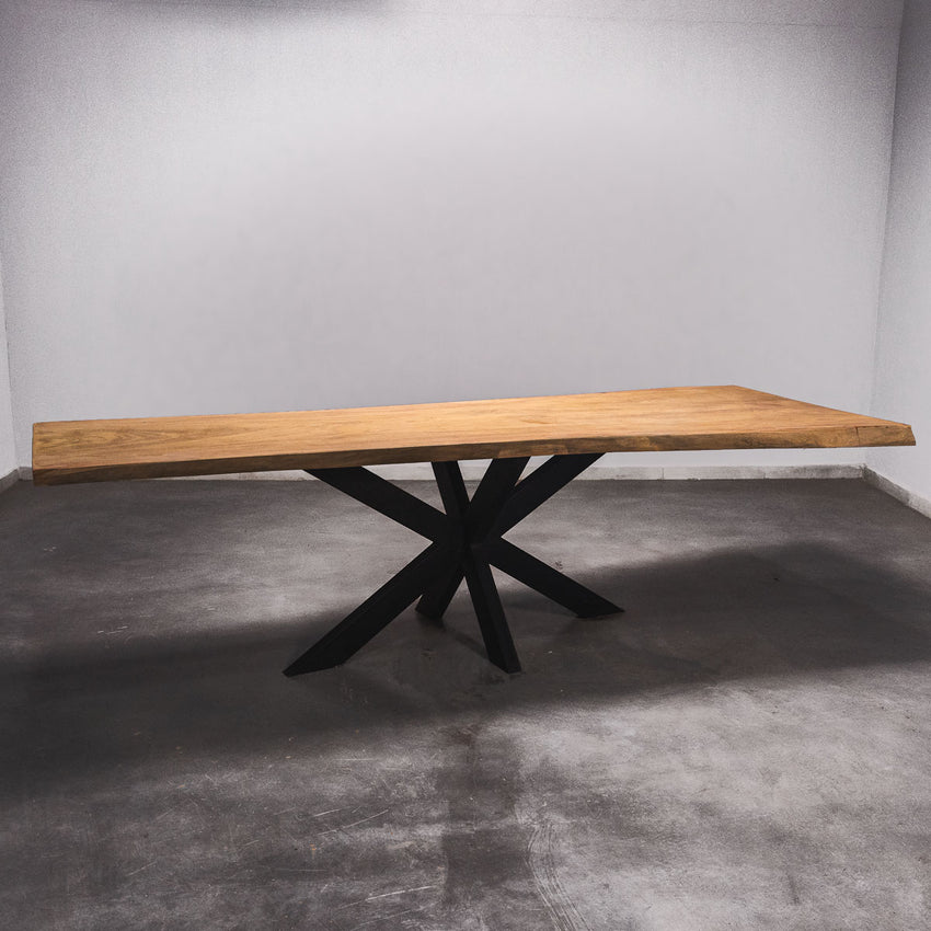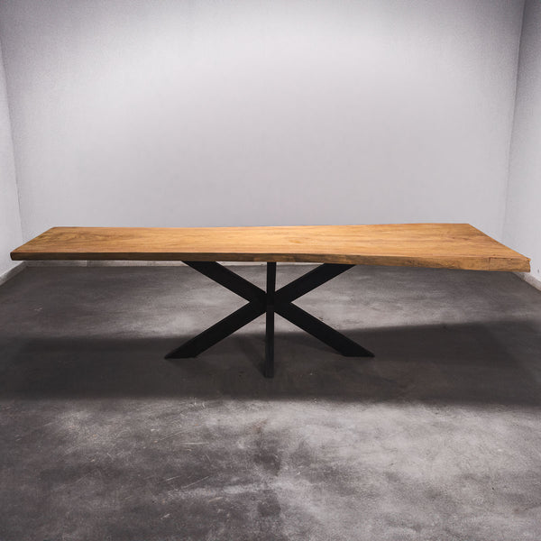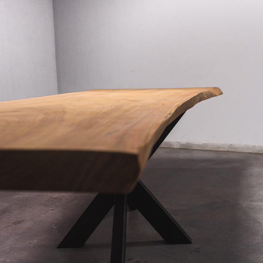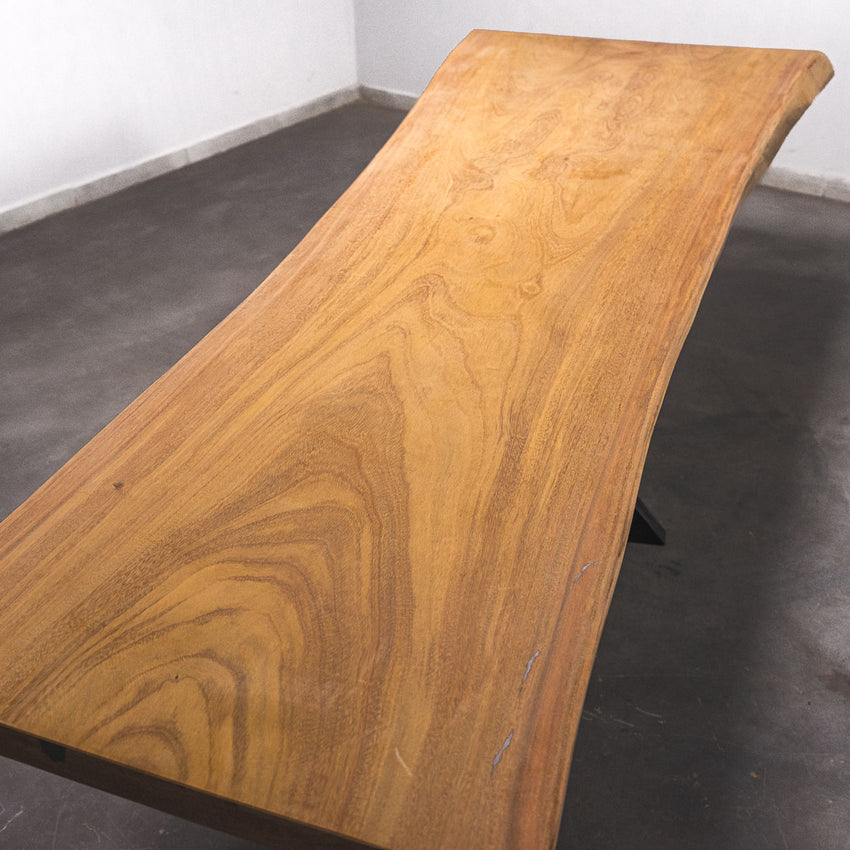 De tafel is gemaakt uit één stuk massief Tali-hout en is 7 cm dik. Daardoor is het hout zeer duurzaam en sterk. Natuurlijk willen wij alleen het beste voor onze klanten, en daarom wordt het hout tot 10 / 12% gedroogd. De onderkant is versterkt met stalen profielen om ervoor te zorgen dat het hout nauwelijks beweegt.