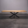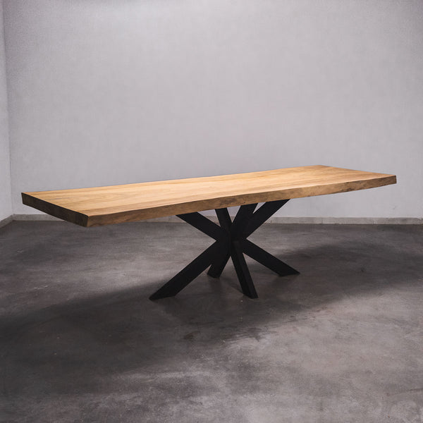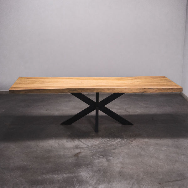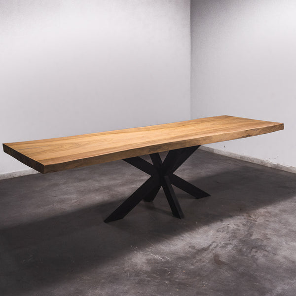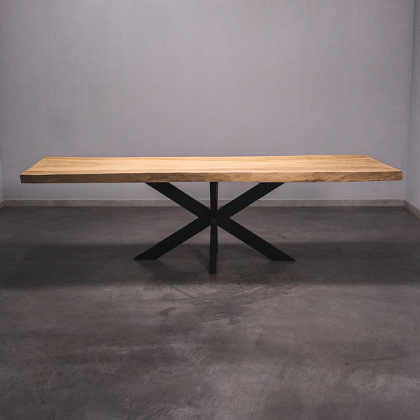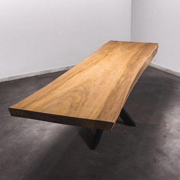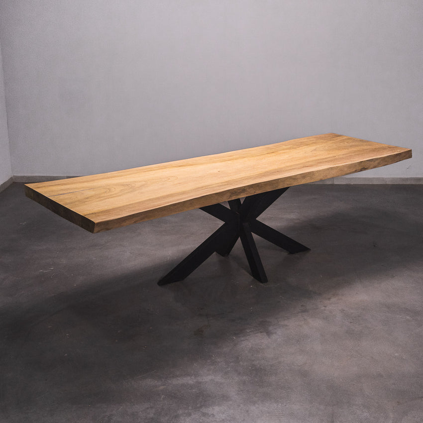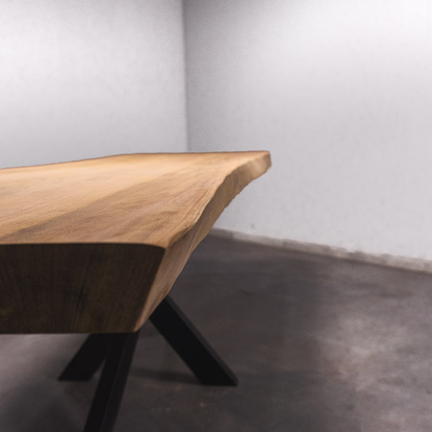 De tafel is gemaakt uit één stuk massief Tali-hout en is 7 cm dik. Daardoor is het hout zeer duurzaam en sterk. Natuurlijk willen wij alleen het beste voor onze klanten, en daarom wordt het hout tot 10 / 12% gedroogd. De onderkant is versterkt met stalen profielen om ervoor te zorgen dat het hout nauwelijks beweegt.