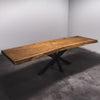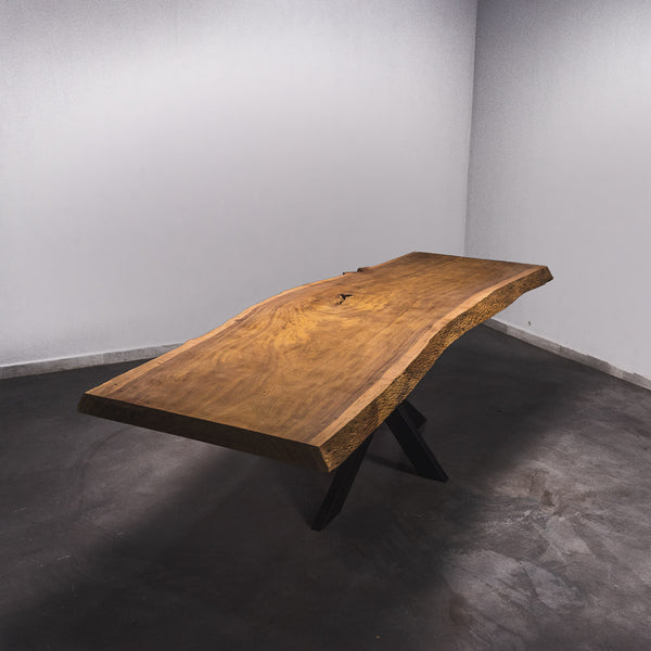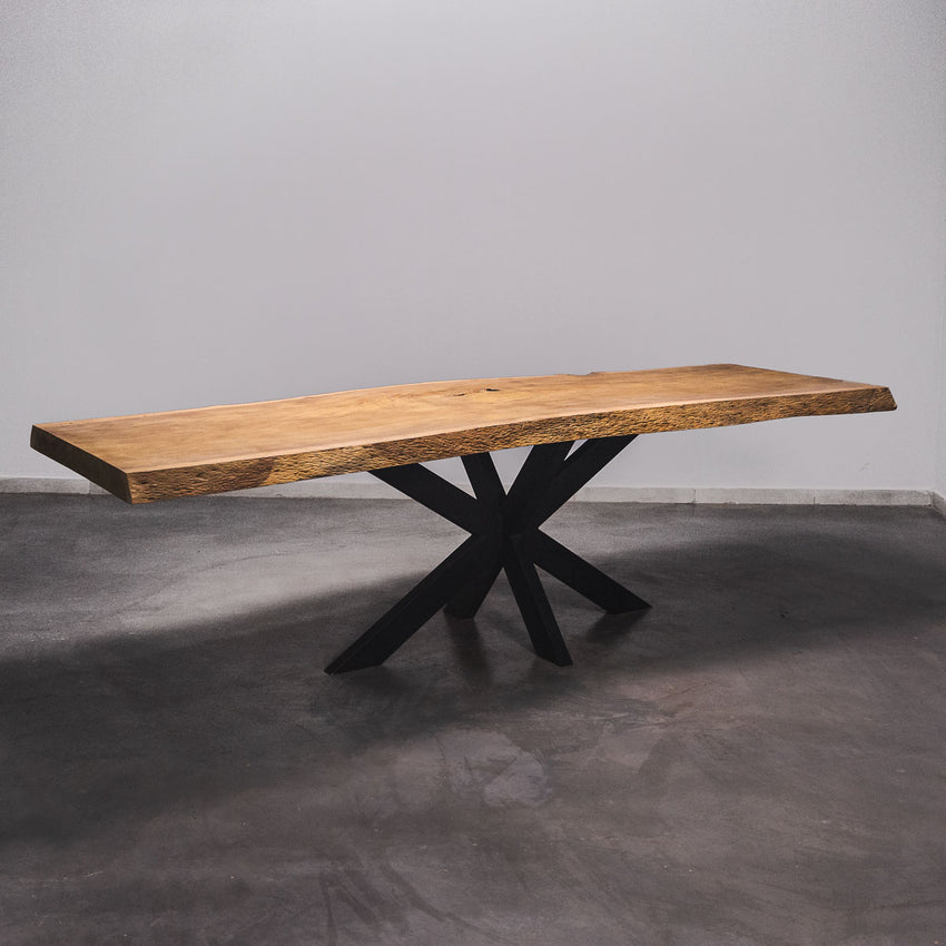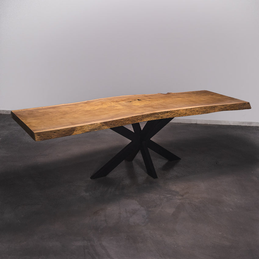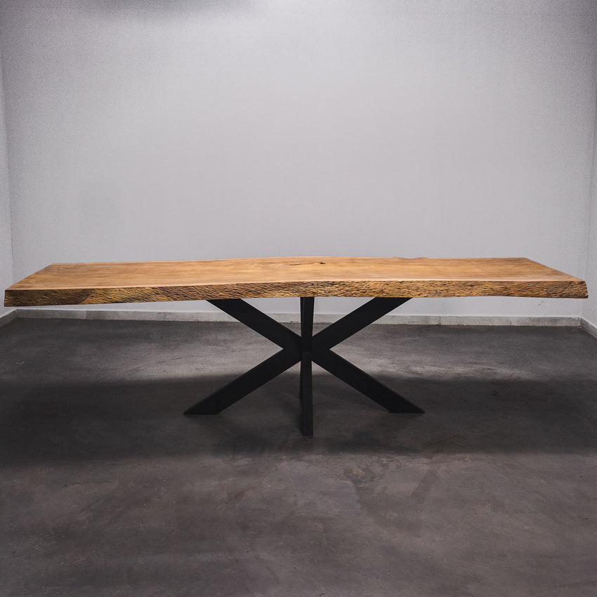 De tafel is gemaakt uit één stuk massief Tali-hout en is 7 cm dik. Daardoor is het hout zeer duurzaam en sterk. Natuurlijk willen wij alleen het beste voor onze klanten, en daarom wordt het hout tot 10 / 12% gedroogd. De onderkant is versterkt met stalen profielen om ervoor te zorgen dat het hout nauwelijks beweegt.