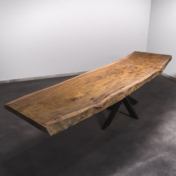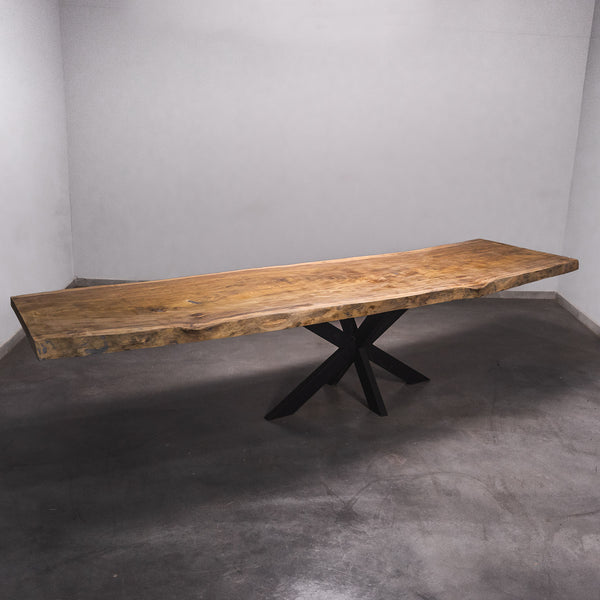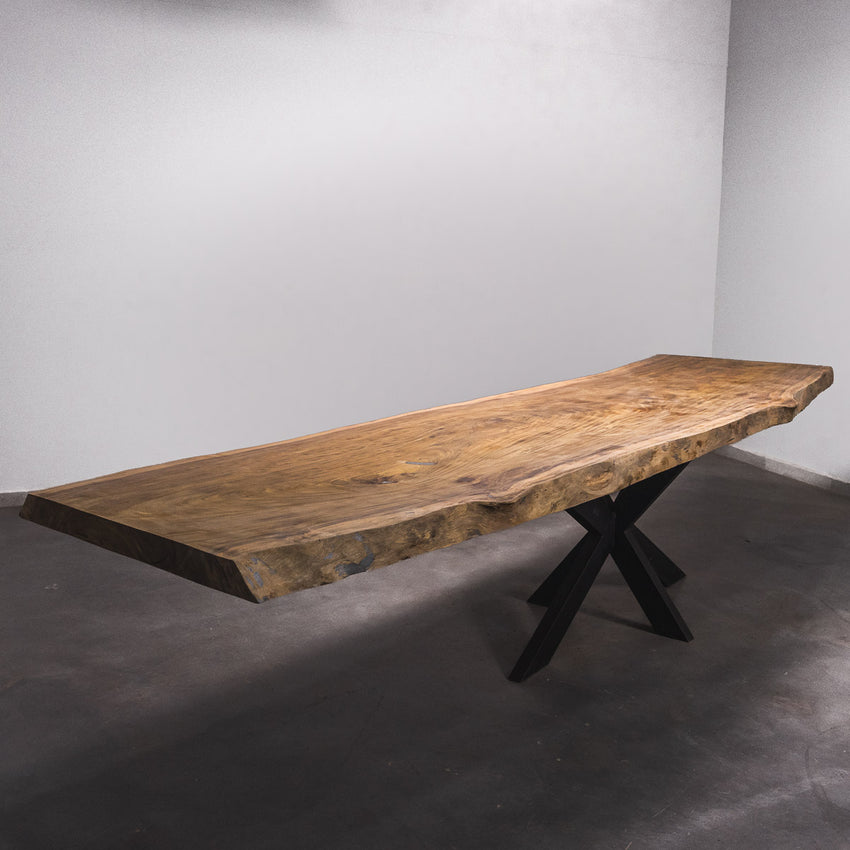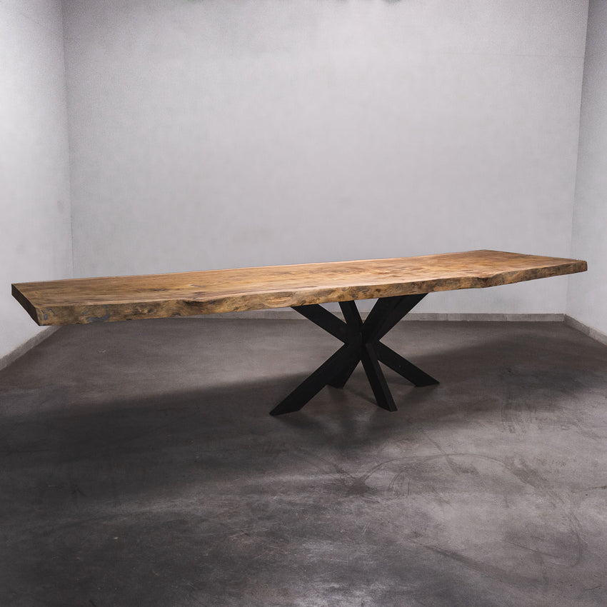 De tafel is gemaakt uit één stuk massief Tali-hout en is 7 cm dik. Daardoor is het hout zeer duurzaam en sterk. Natuurlijk willen wij alleen het beste voor onze klanten, en daarom wordt het hout tot 10 / 12% gedroogd. De onderkant is versterkt met stalen profielen om ervoor te zorgen dat het hout nauwelijks beweegt.