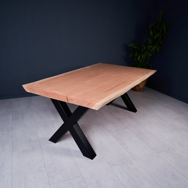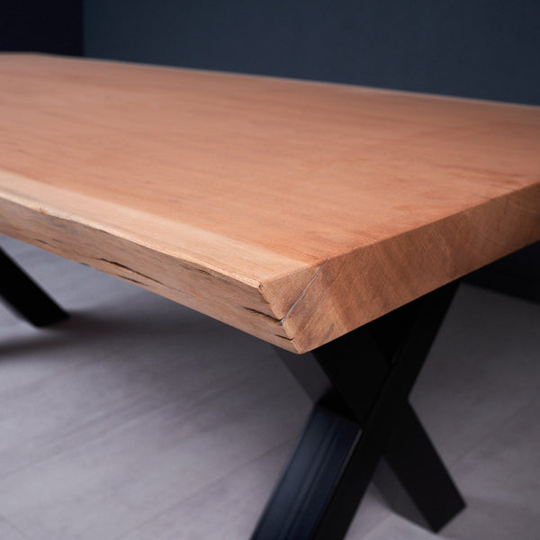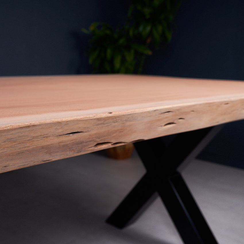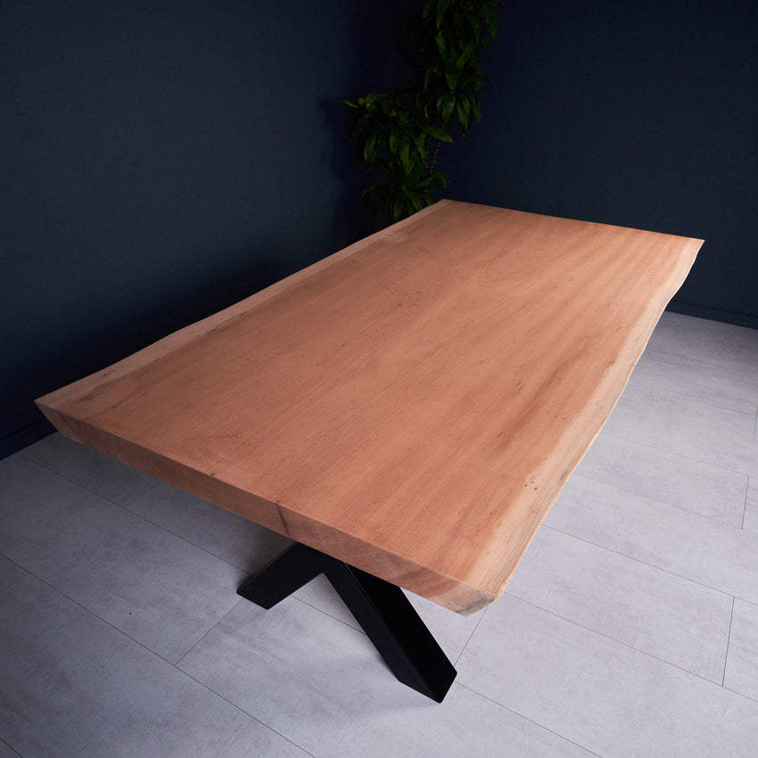 De tafel is gemaakt uit één stuk massief sipo hout en is 7 cm dik. Daardoor is het hout zeer duurzaam en sterk. Natuurlijk willen wij alleen het beste voor onze klanten, en daarom wordt het hout tot 10 / 12% gedroogd. De onderkant is versterkt met stalen profielen om ervoor te zorgen dat het hout nauwelijks beweegt.
