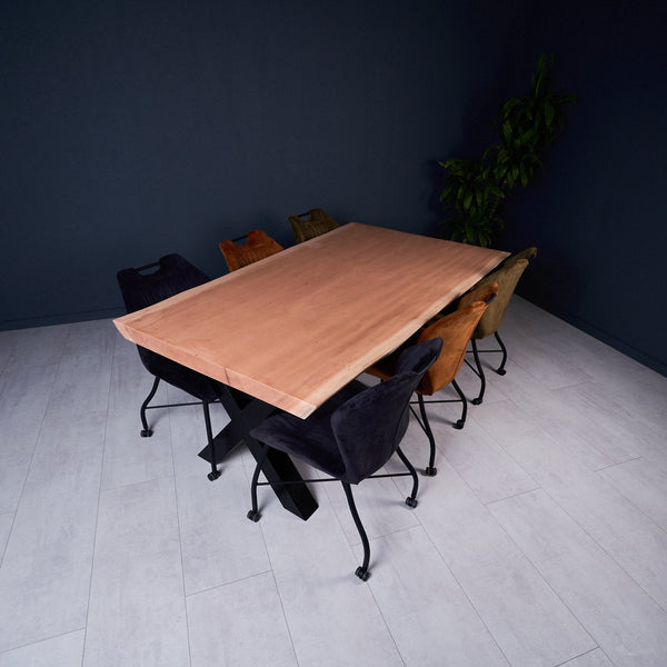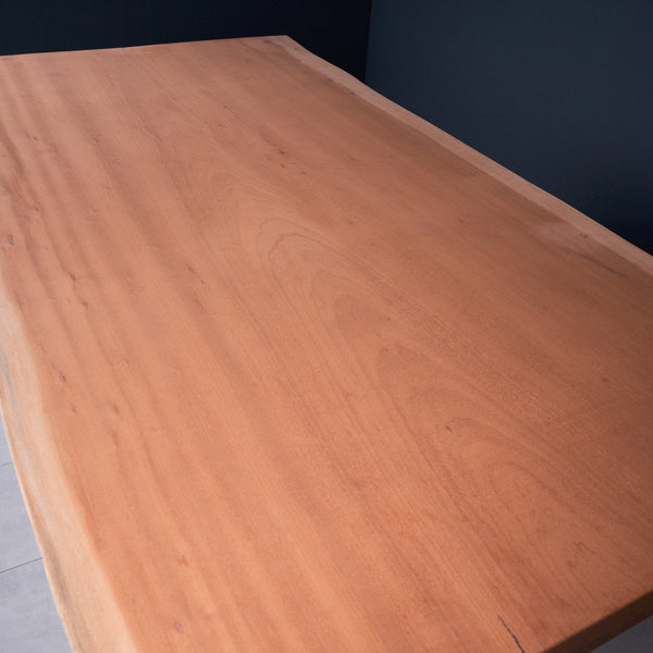 Sipo is een prachtig hardhout met een schitterende, gelijkmatige kleuring. Het tafelblad is gemaakt uit één stuk massief sipo hout dat de vorm van de boom volgt. Het hout heeft een bijzondere rozerode kleur die na verloop van tijd iets donkerder wordt. De buitenkant heeft een herkenbare lichte tint. Als het zonlicht erop schijnt, ontstaat er een stralende gouden glans op het tafelblad. Sipo hout heeft een karakteristiek regelmatig strepenpatroon van de groei en ziet er daardoor strak en edel uit. Het hout is zeer duurzaam en slijtvast en zal jaren meegaan.Afmetingen