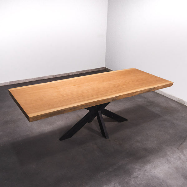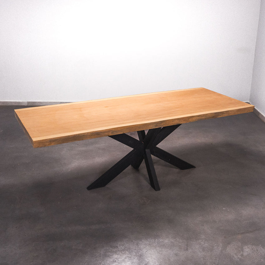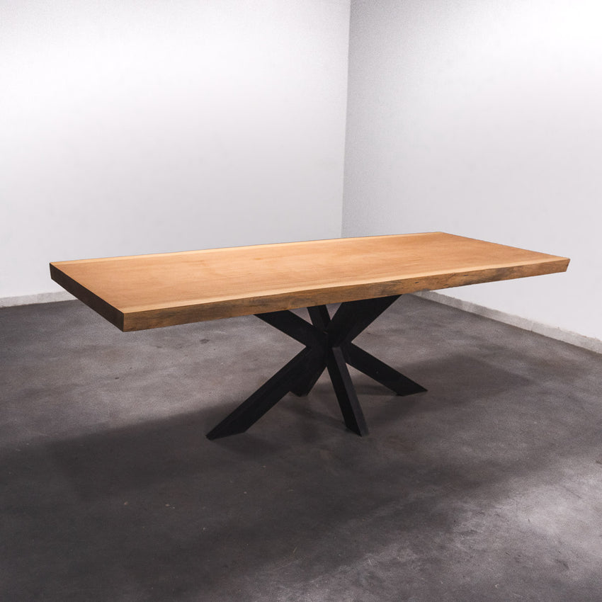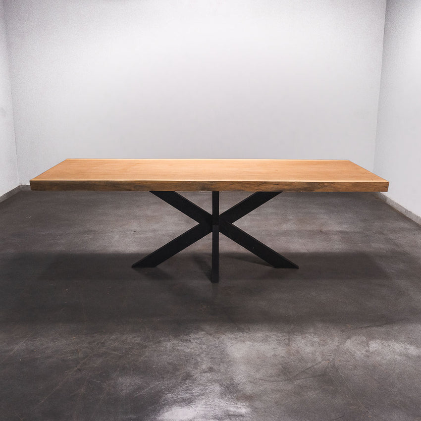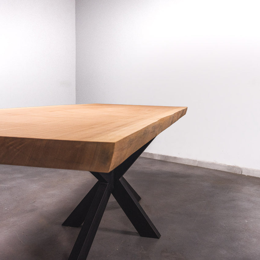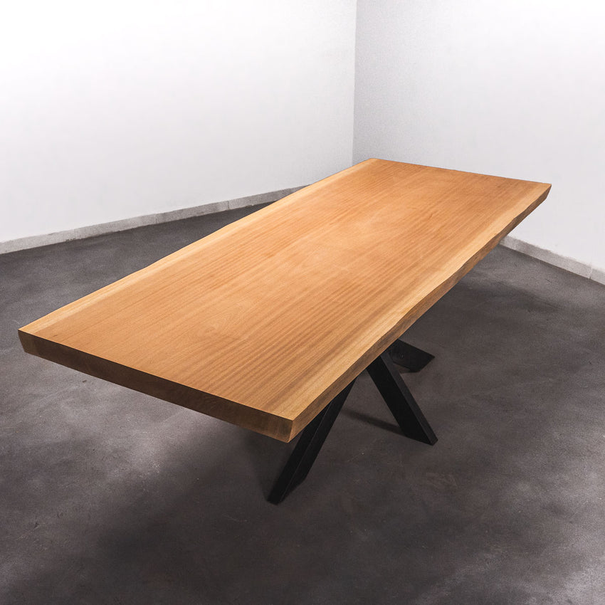 De tafel is gemaakt uit één stuk massief sapelli hout en is 7 cm dik. Daardoor is het hout zeer duurzaam en sterk. Natuurlijk willen wij alleen het beste voor onze klanten, en daarom wordt het hout tot 10 / 12% gedroogd. De onderkant is versterkt met stalen profielen om ervoor te zorgen dat het hout nauwelijks beweegt.