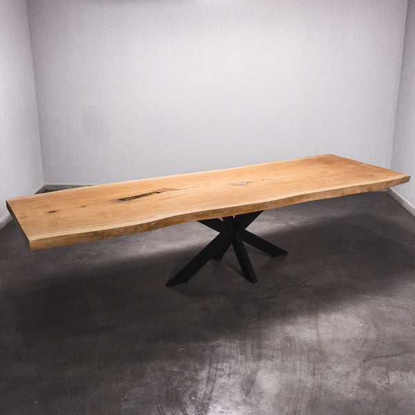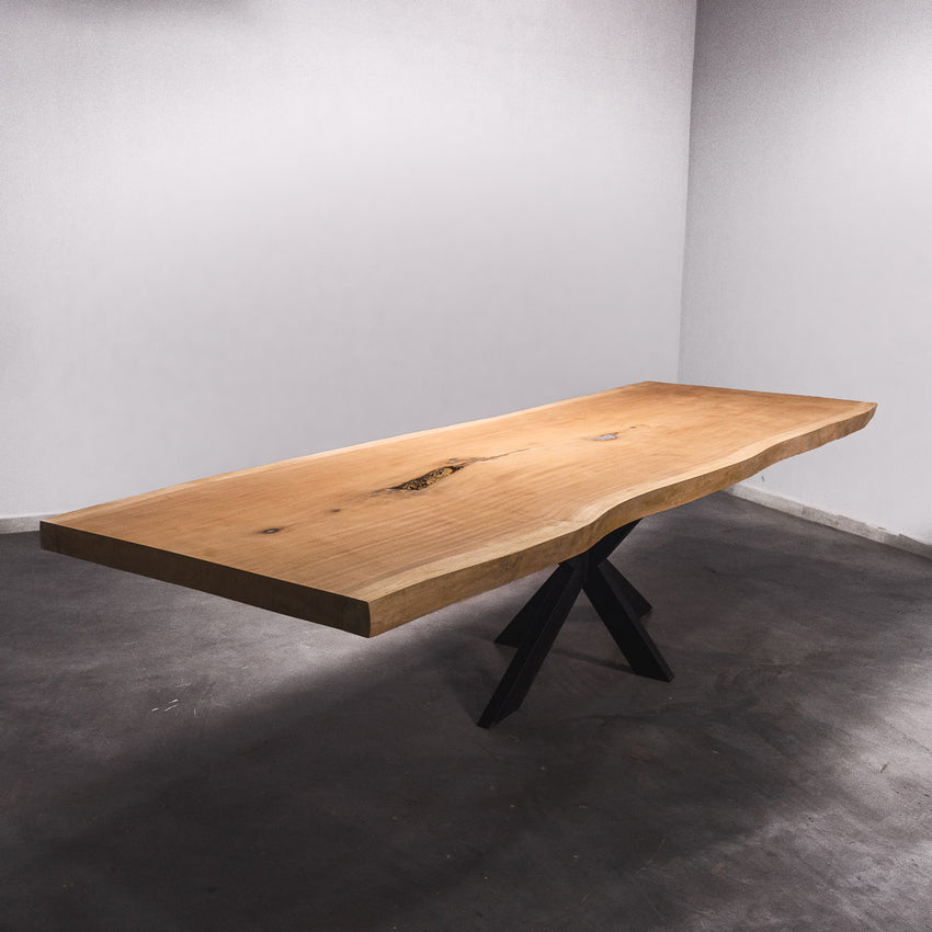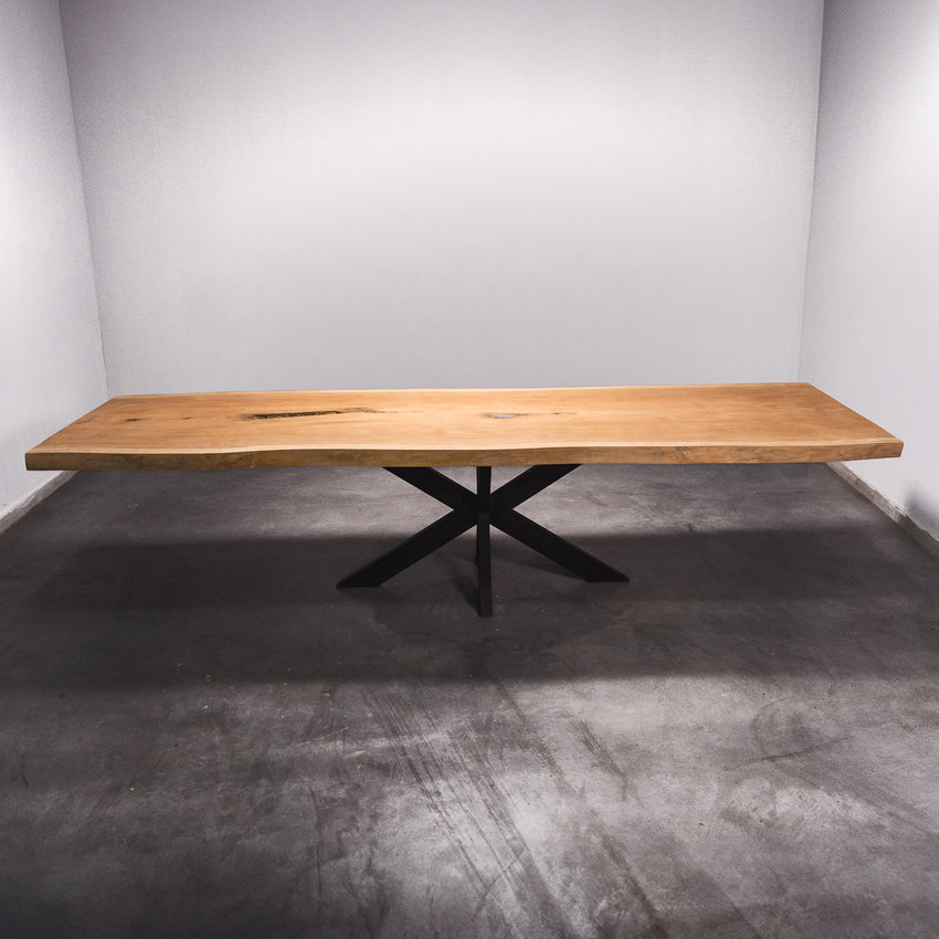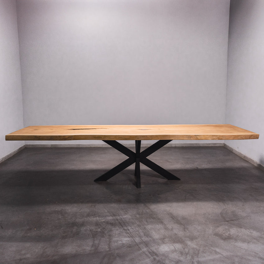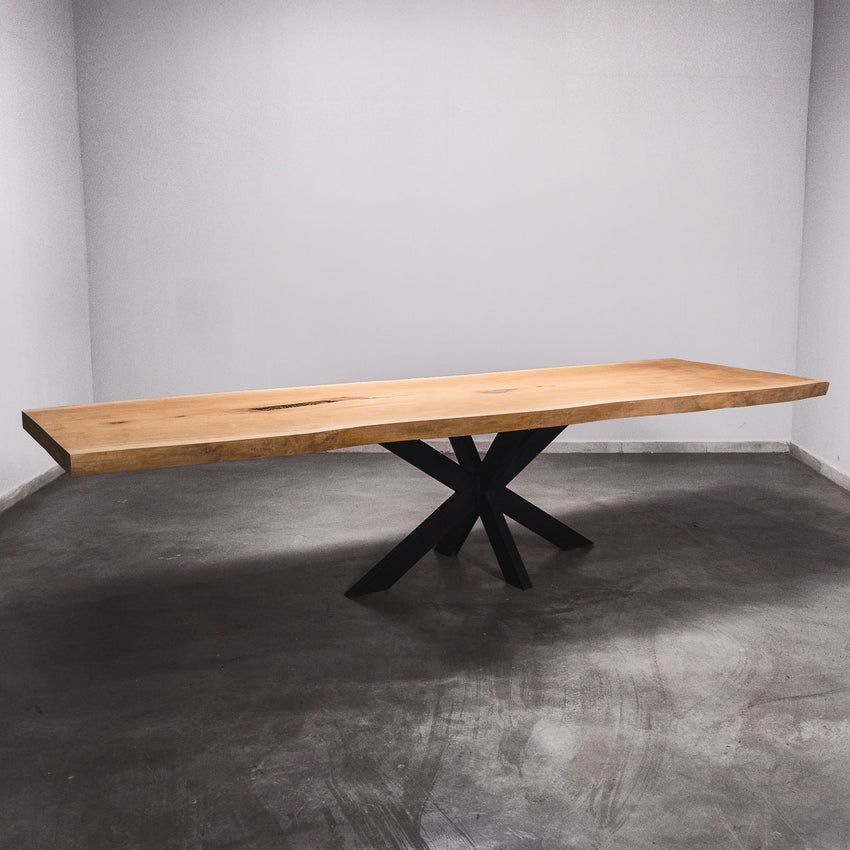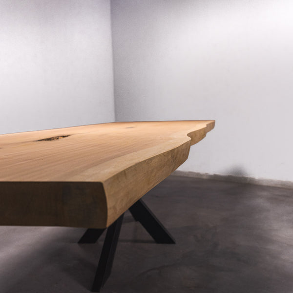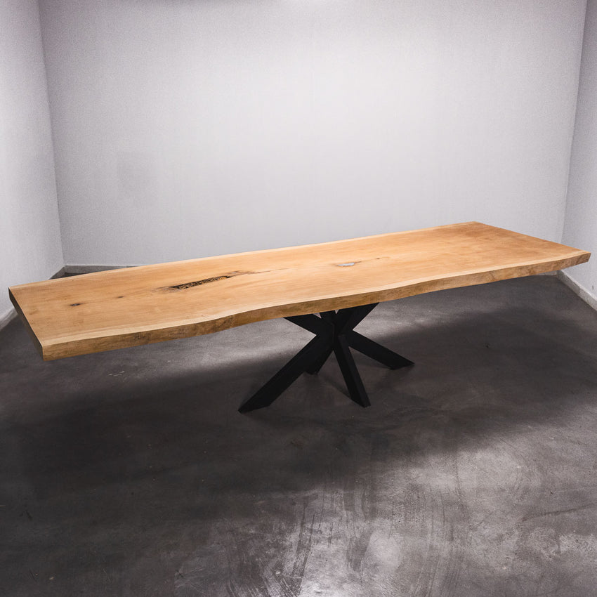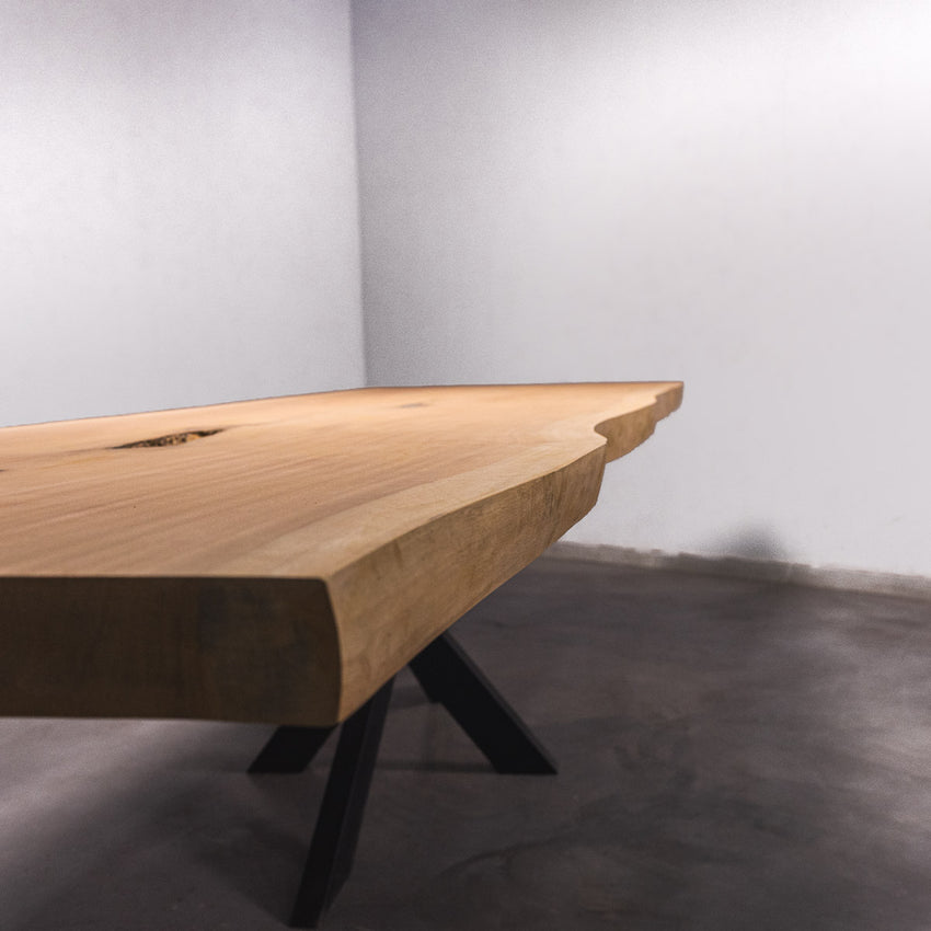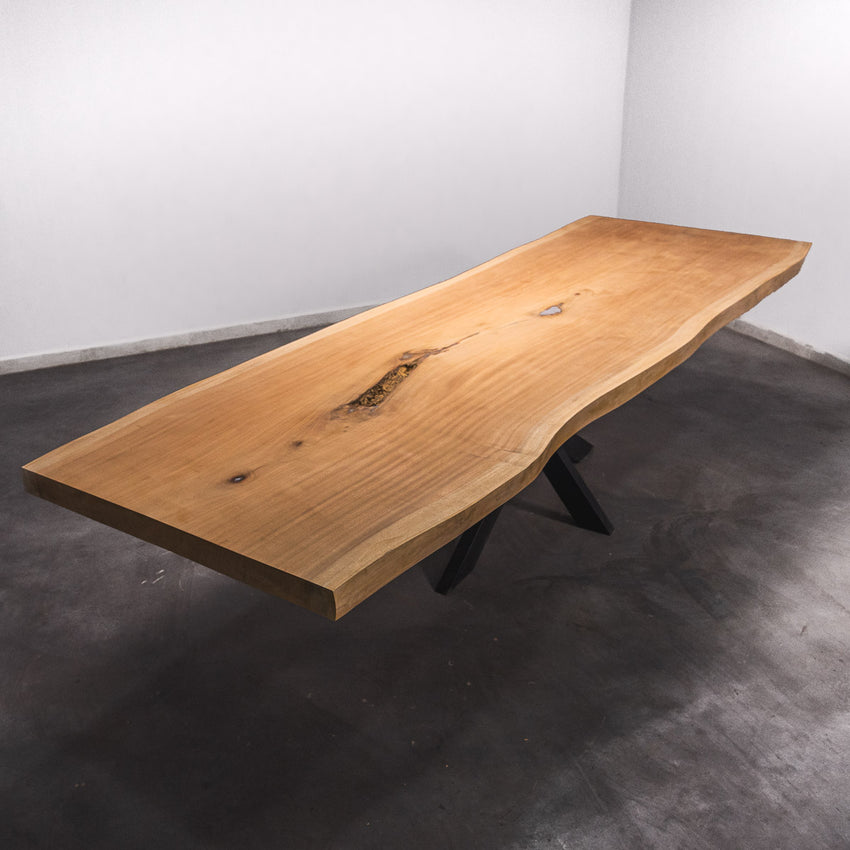 De tafel is gemaakt uit één stuk massief sapelli hout en is 7 cm dik. Daardoor is het hout zeer duurzaam en sterk. Natuurlijk willen wij alleen het beste voor onze klanten, en daarom wordt het hout tot 10 / 12% gedroogd. De onderkant is versterkt met stalen profielen om ervoor te zorgen dat het hout nauwelijks beweegt.