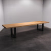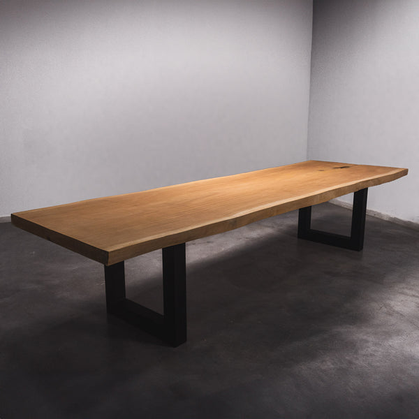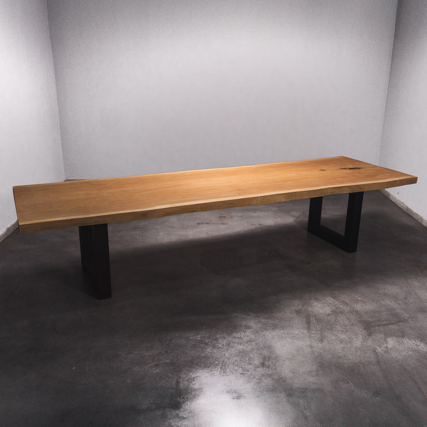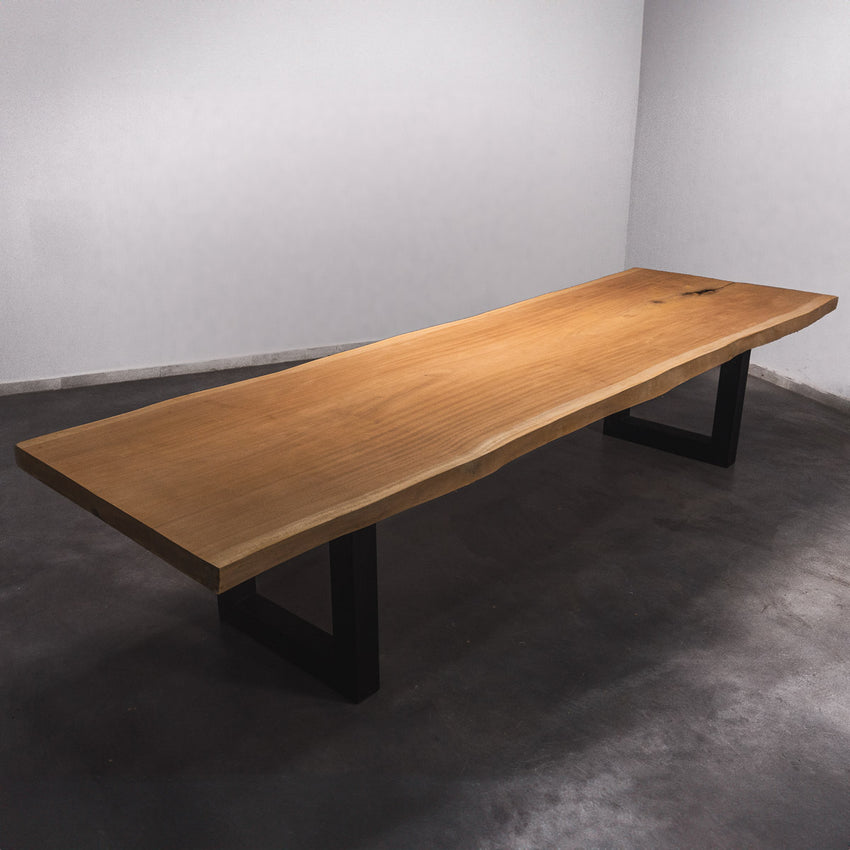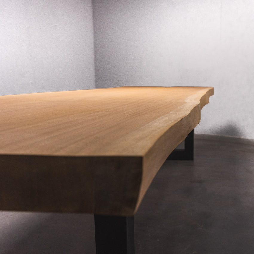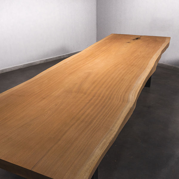 De tafel is gemaakt uit één stuk massief sapelli hout en is 7 cm dik. Daardoor is het hout zeer duurzaam en sterk. Natuurlijk willen wij alleen het beste voor onze klanten, en daarom wordt het hout tot 10 / 12% gedroogd. De onderkant is versterkt met stalen profielen om ervoor te zorgen dat het hout nauwelijks beweegt.