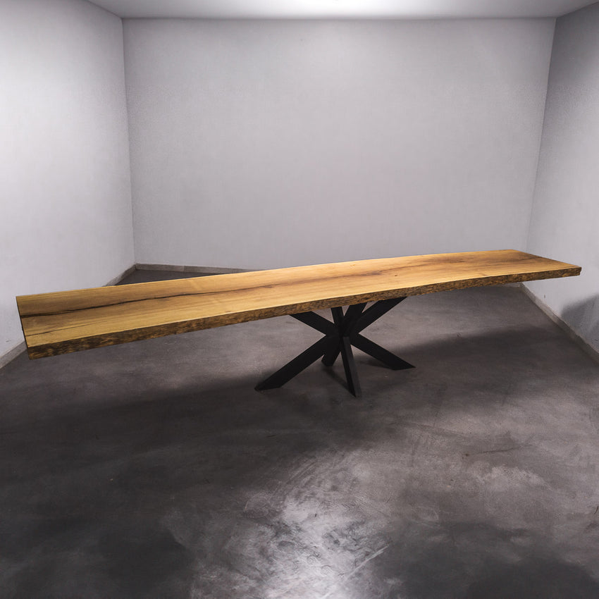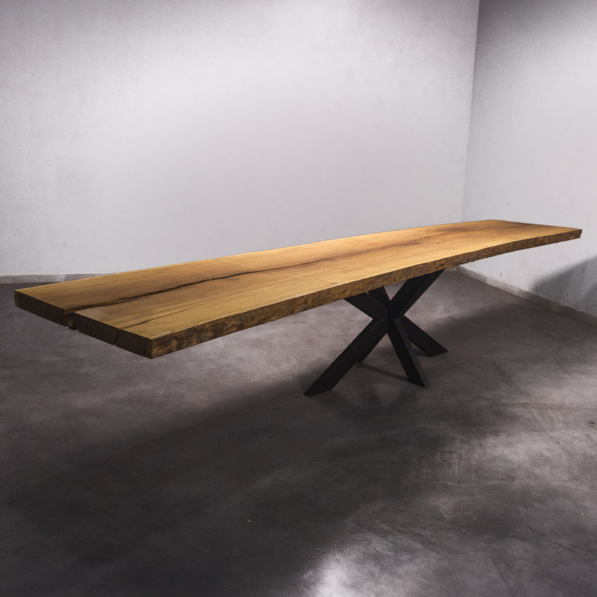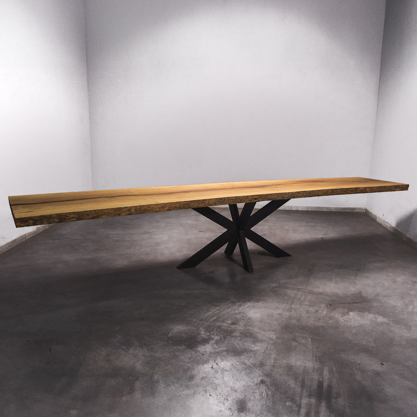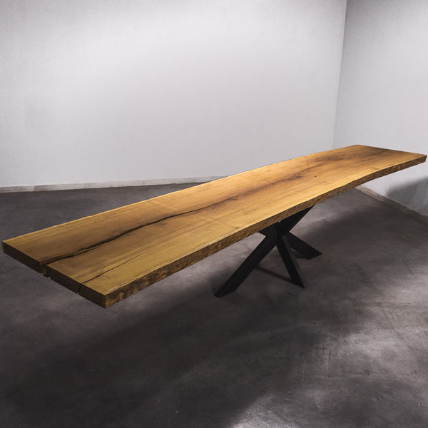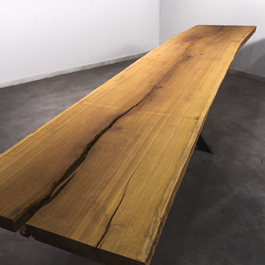 De tafel is gemaakt uit één stuk massief Iroko hout en is 7 cm dik. Daardoor is het hout zeer duurzaam en sterk. Natuurlijk willen wij alleen het beste voor onze klanten, en daarom wordt het hout tot 10 / 12% gedroogd. De onderkant is versterkt met stalen profielen om ervoor te zorgen dat het hout nauwelijks beweegt.